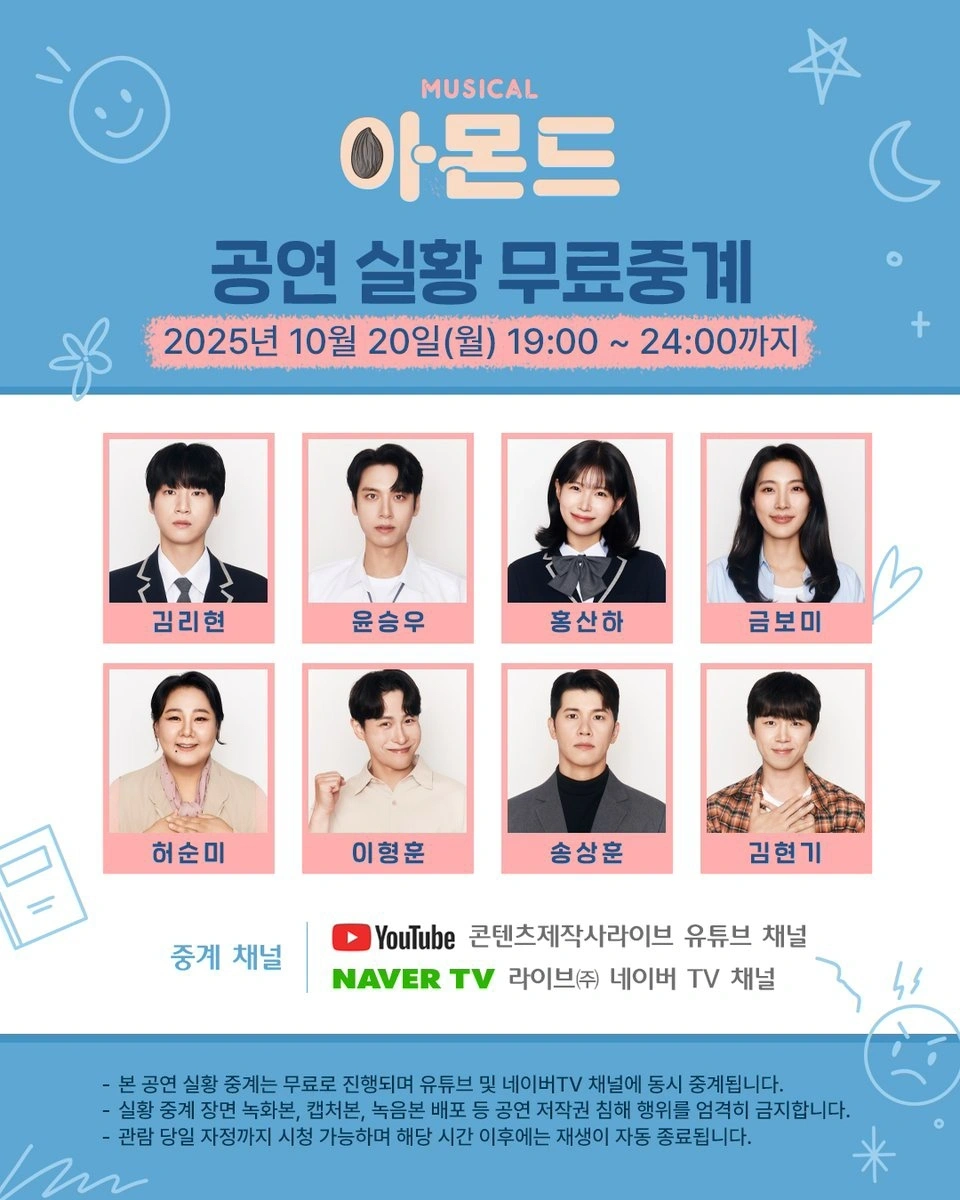 [당일] 😐#뮤지컬아몬드 공연 실황 무료중계 ❝감정을 느끼지 못하는 소년의 특별한 성장이야기❞ 10월 20일(월) 단 하루, 2025 뮤지컬 <아몬드>의 공연 실황을 라이브 공식 유튜브와 네이버TV 채널을 통해 무료 중계합니다. 무대 위 감동을 생생하게 경험해보세요! 🦋출연 배우: 김리현, 윤승우, 홍산하, 금보미, 허순미, 이형훈, 송상훈, 김현기 🦋중계 일시: 10월 20일(월) 19:00~24:00까지 🦋중계 채널: 1) 콘텐츠제작사라이브 유튜브 2) 라이브㈜ 네이버TV 채널 *본 공연 실황 영상은 중계 당일 자정까지 시청 가능합니다. *자세한 내용은 이미지를 통해 확인해 주시기 바랍니다. 뮤지컬 <아몬드> 2025.09.19~2025.12.14 NOL 유니플렉스 1관 😍보는중ㅎㅎ 다들 언능 채널 들어가서 보세요~~~❤️