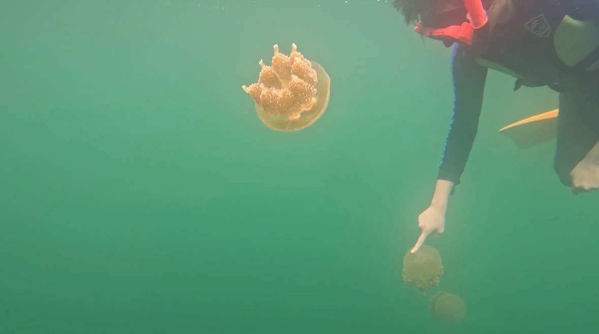 水母湖為了拍水母游一個太快樂太遠,回程游到好累⋯⋯腿軟離開還要爬山(゚々。)(水母湖是封閉湖,島的底部跟海接通,要抵達需要爬樓梯