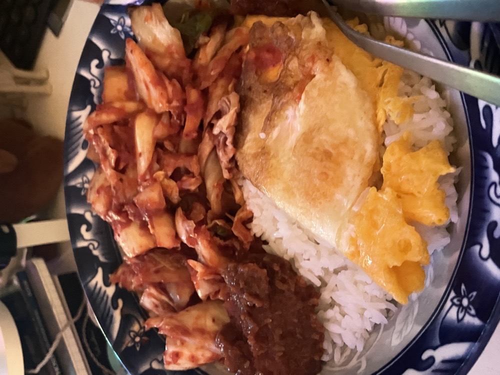 this has been my dinner the past week heheheh i love kimchi and rice bowls. This is just rice, kimchi, non-spicy gochujang and a fried egg >:) The pic was from last night but i'm making it again later mwahahahahaah