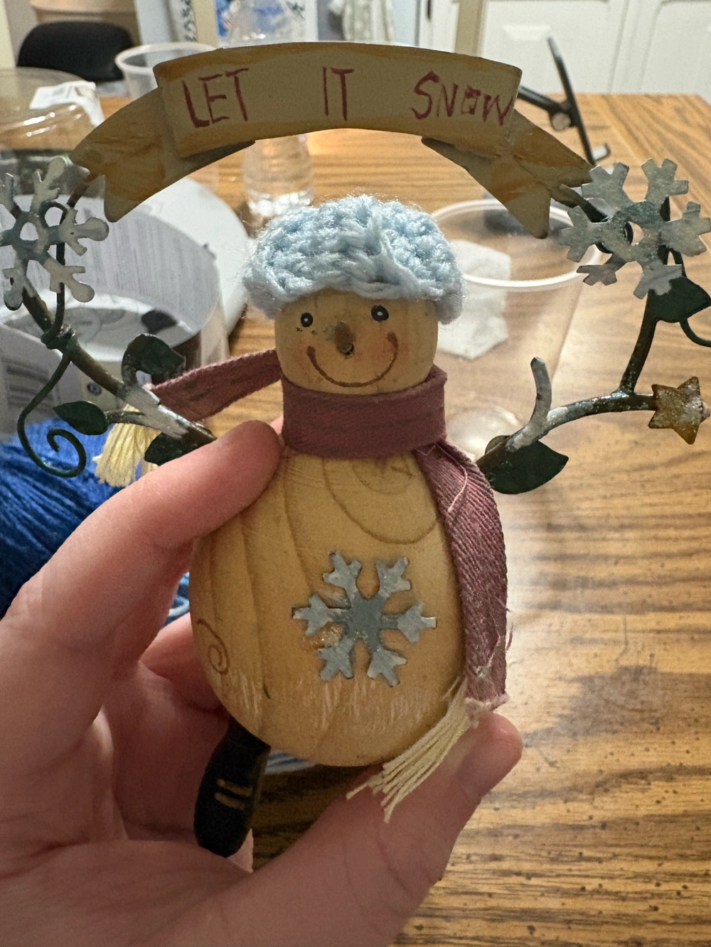 My mom thought it would be cute if I made a little hat for this snowman ornament since it’s bald lol so I did and it looks like it has a bowl cut! 😂We’re going to add a mini pom Pom ball tomorrow so that it hopefully looks more like a tobaggan hat lol