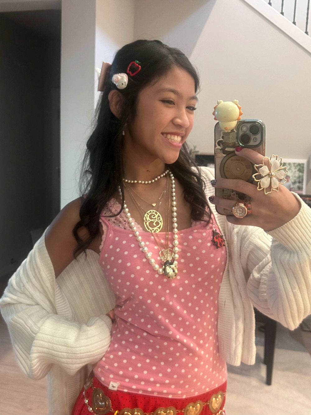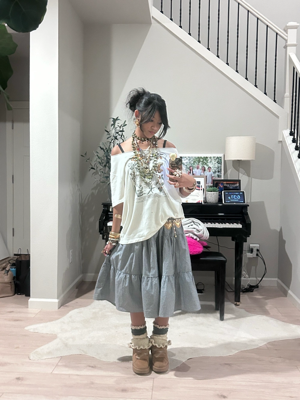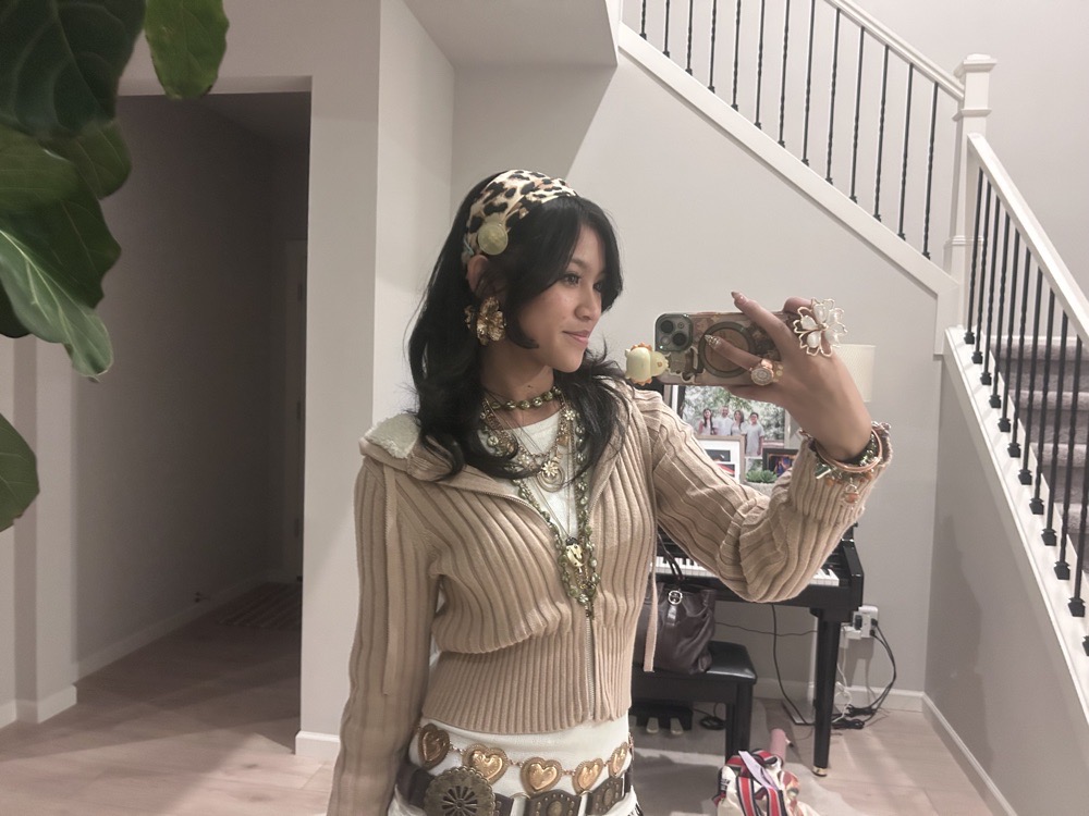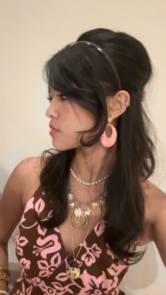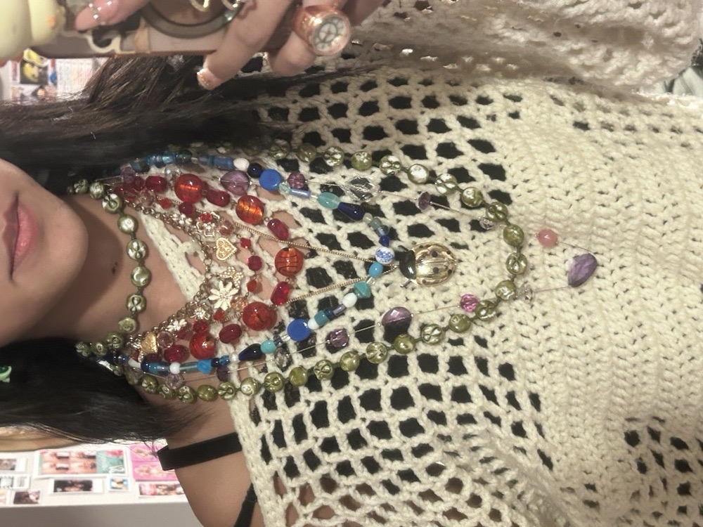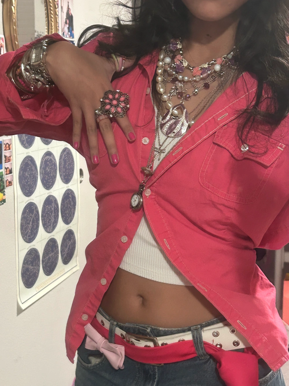 me and my friend had matching earings today !! super fun shell outfit today even though it was cold, my earrings and belt (that’s actually a necklace) r a matching set