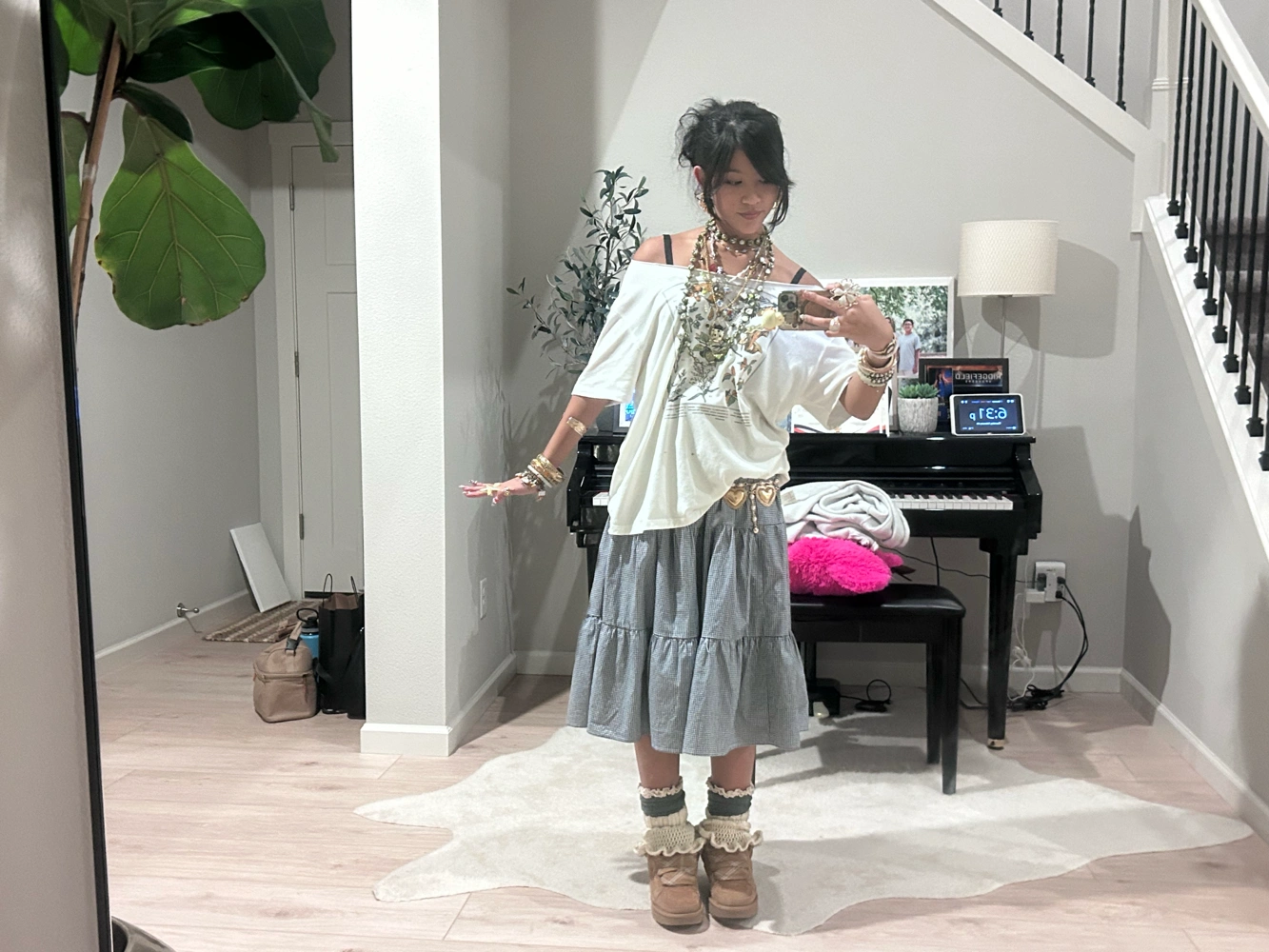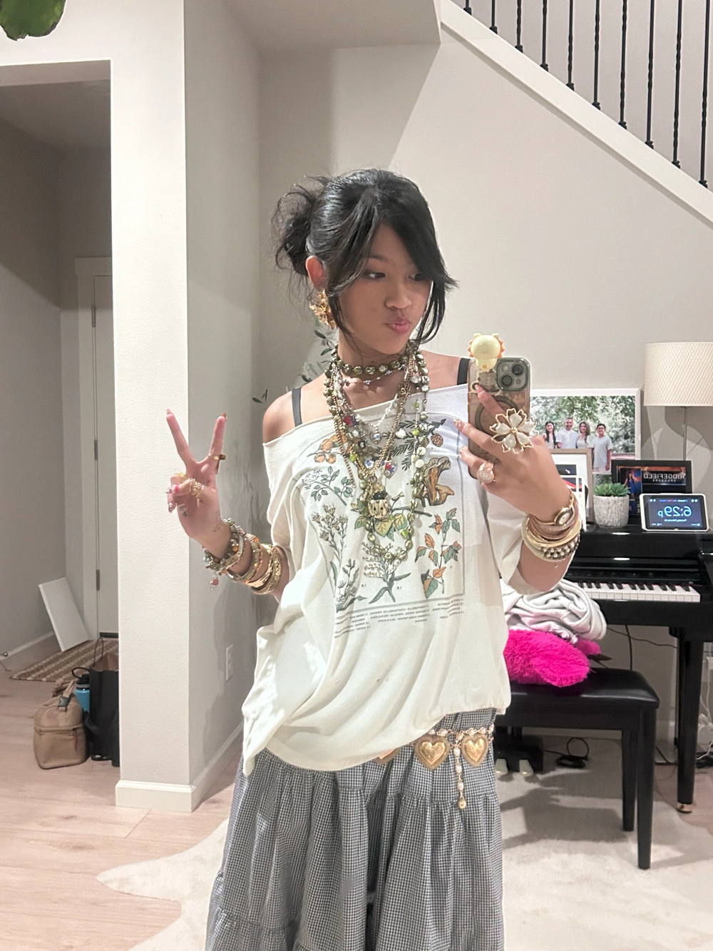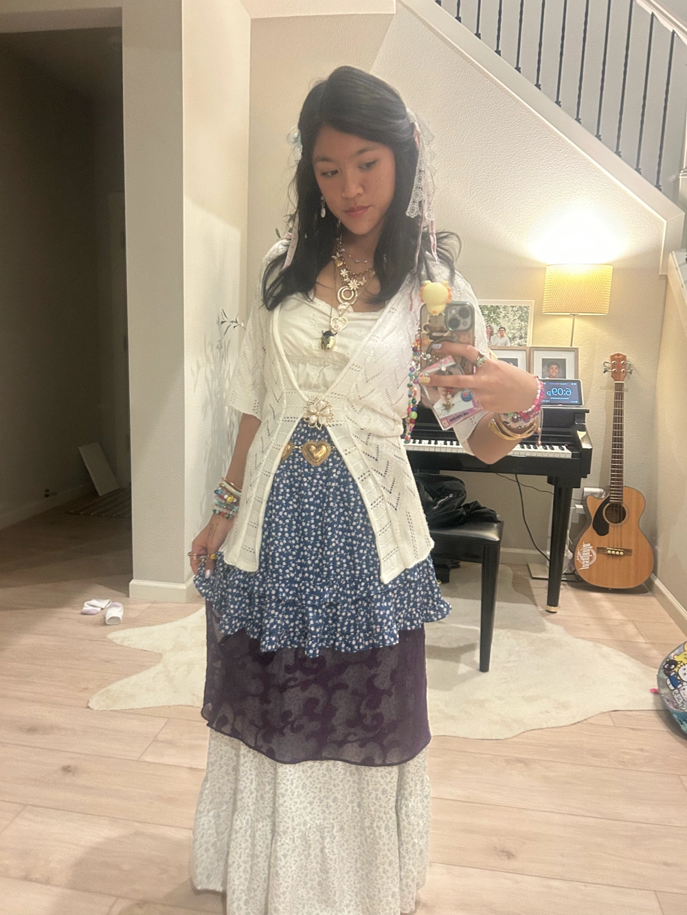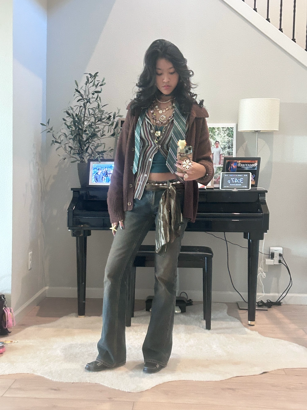 me and my friend had matching earings today !! super fun shell outfit today even though it was cold, my earrings and belt (that’s actually a necklace) r a matching set