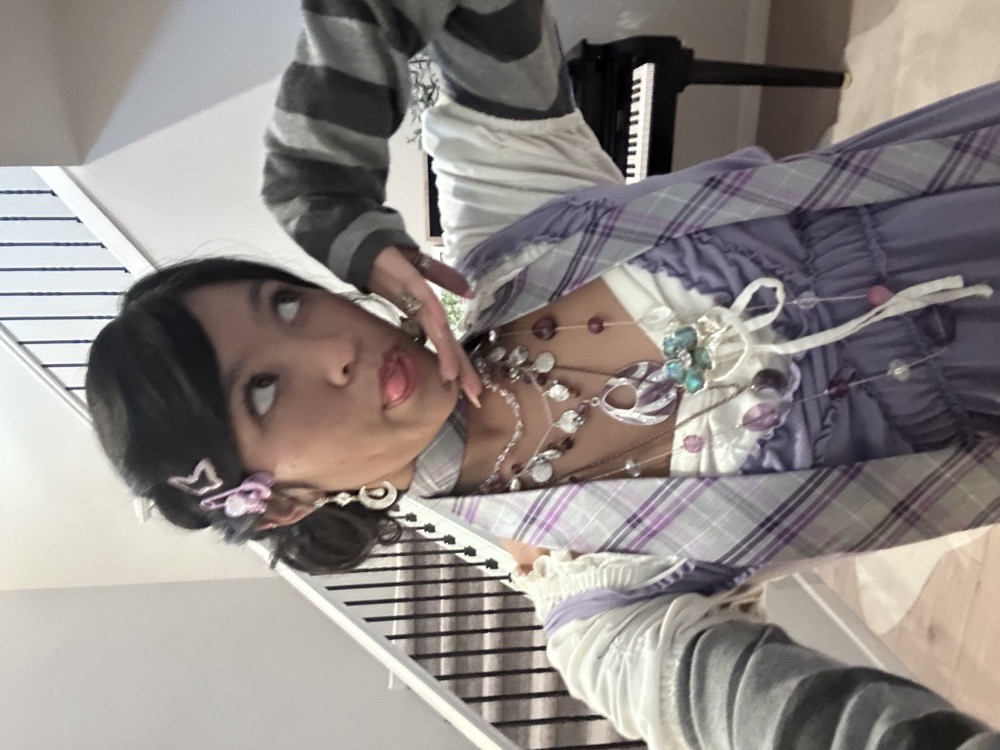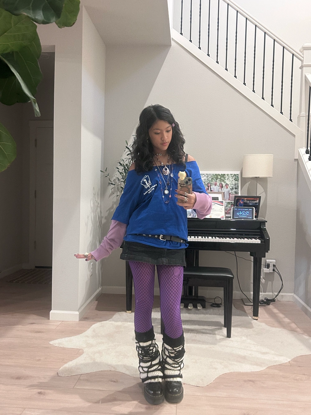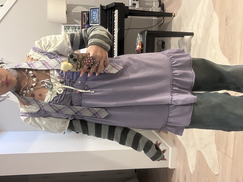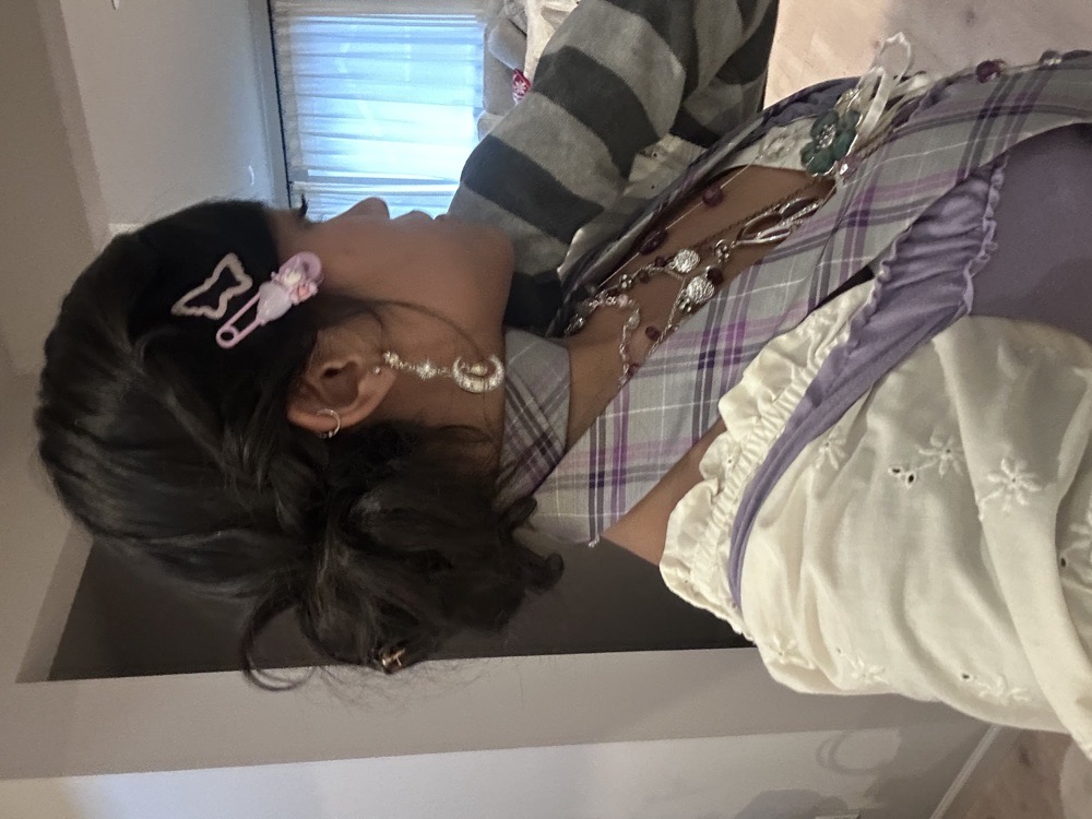 purple purple purple !! a lot of people liked my necklace stack today, even my old psych teacher (??) i love layering my black lace tights theyre so fun also its hard to see but i liked my hair today too i was able to braid it myself in like 3 minutes