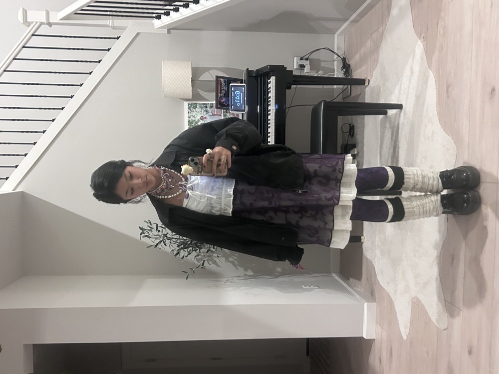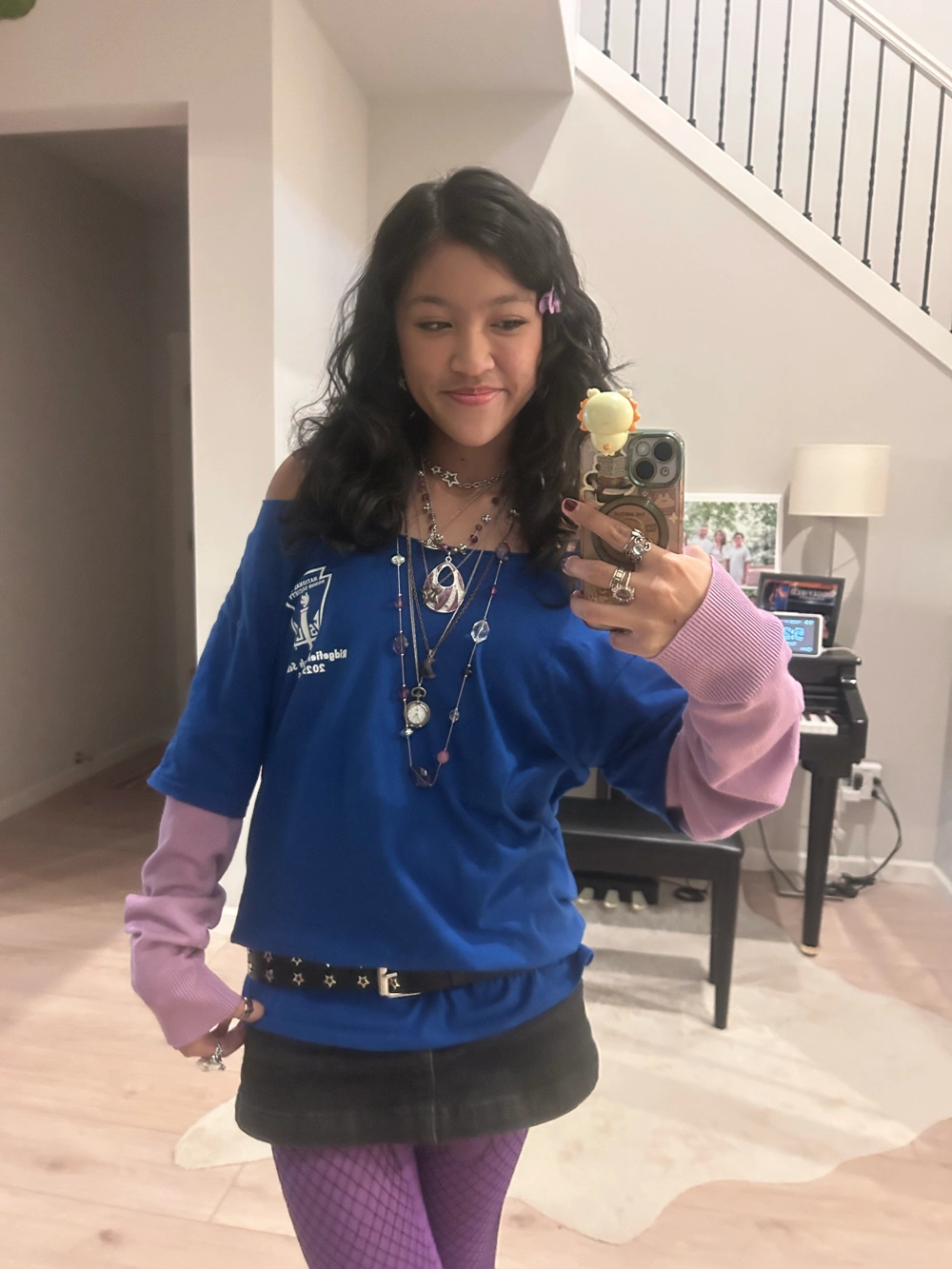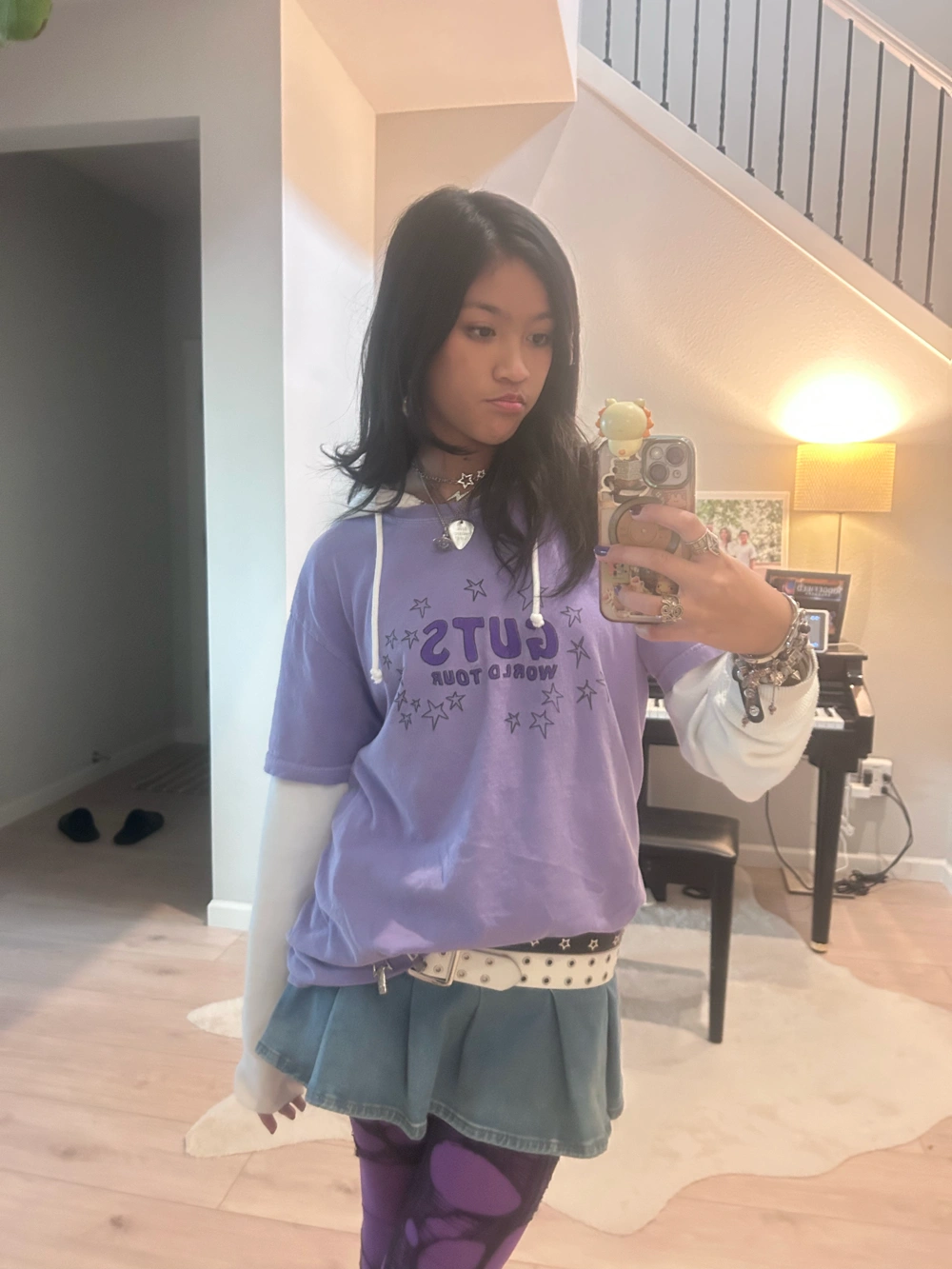 purple purple purple !! a lot of people liked my necklace stack today, even my old psych teacher (??) i love layering my black lace tights theyre so fun also its hard to see but i liked my hair today too i was able to braid it myself in like 3 minutes
