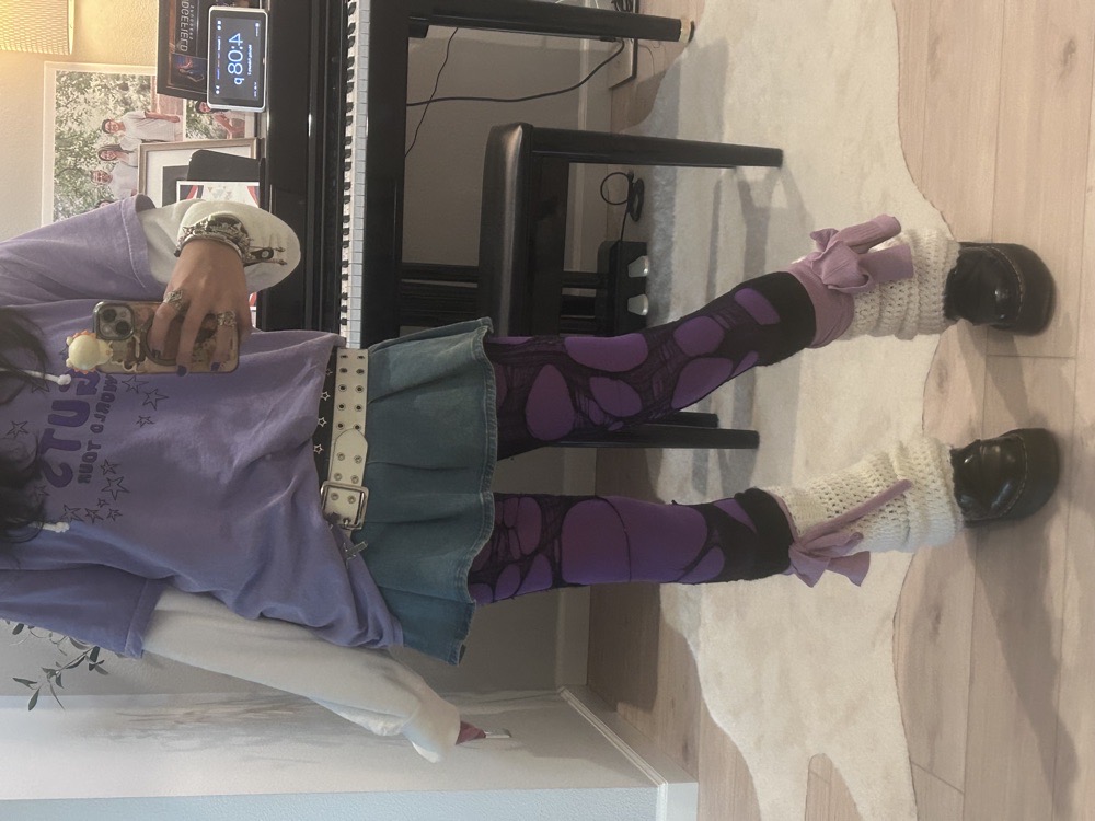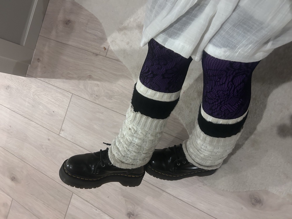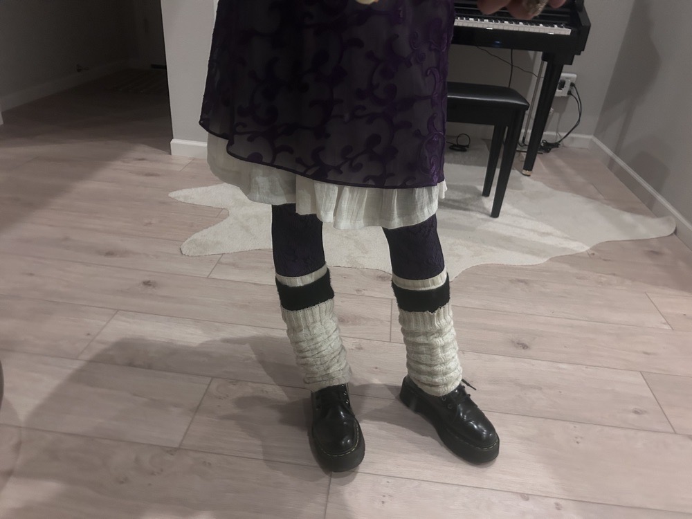 purple week !💜 tried a new thing w my leg warmers ? i found an old cardigan then cut it up and tied it around my ankles, thought it fit w my tights