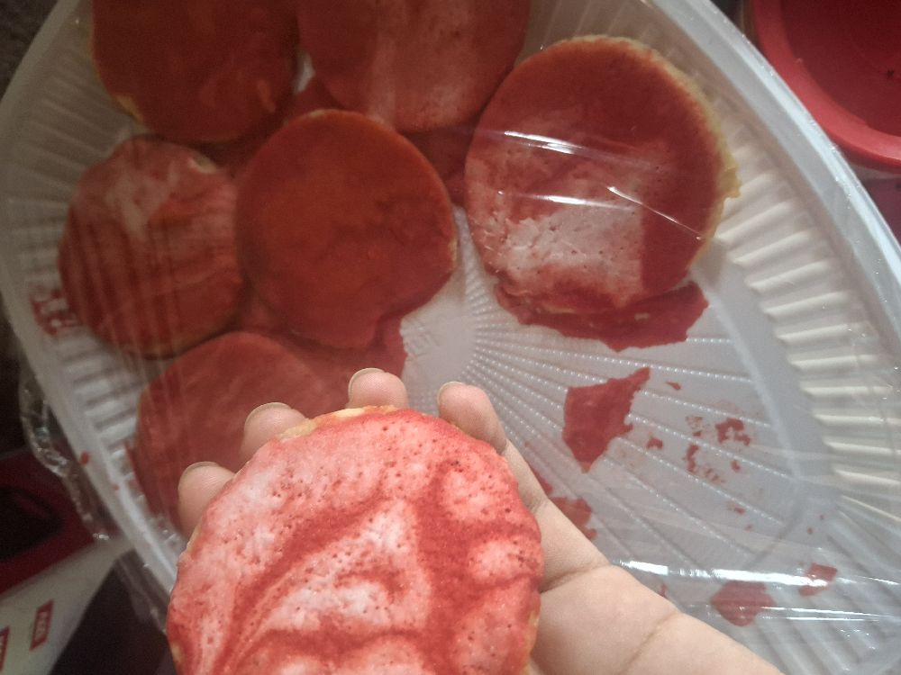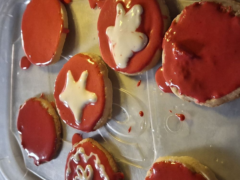 fiz biscoitos, mas como foi minha primeira vez usando glacê real, eu nao soube o que fazer e os desenhos que fiz derreteram... (como mostra na segunda imagem)