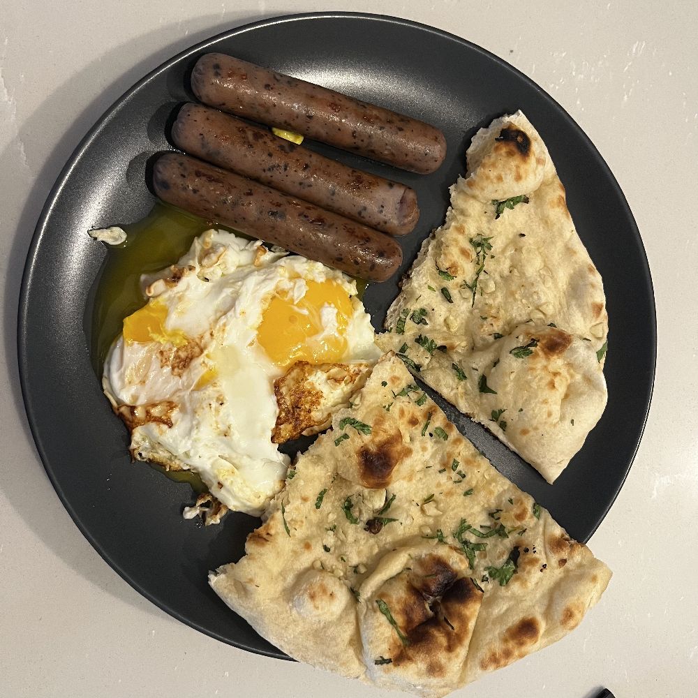 for breakfast, i had two over-medium fried eggs, three blueberry sausage links, and some leftover garlic naan. it was delightful! i had never tried blueberry sausage before and i was genuinely surprised at how good it was. the savory taste of the sausage provided contrast to the sweetness of the blueberries 9.5/10 would have blueberry sausage again!