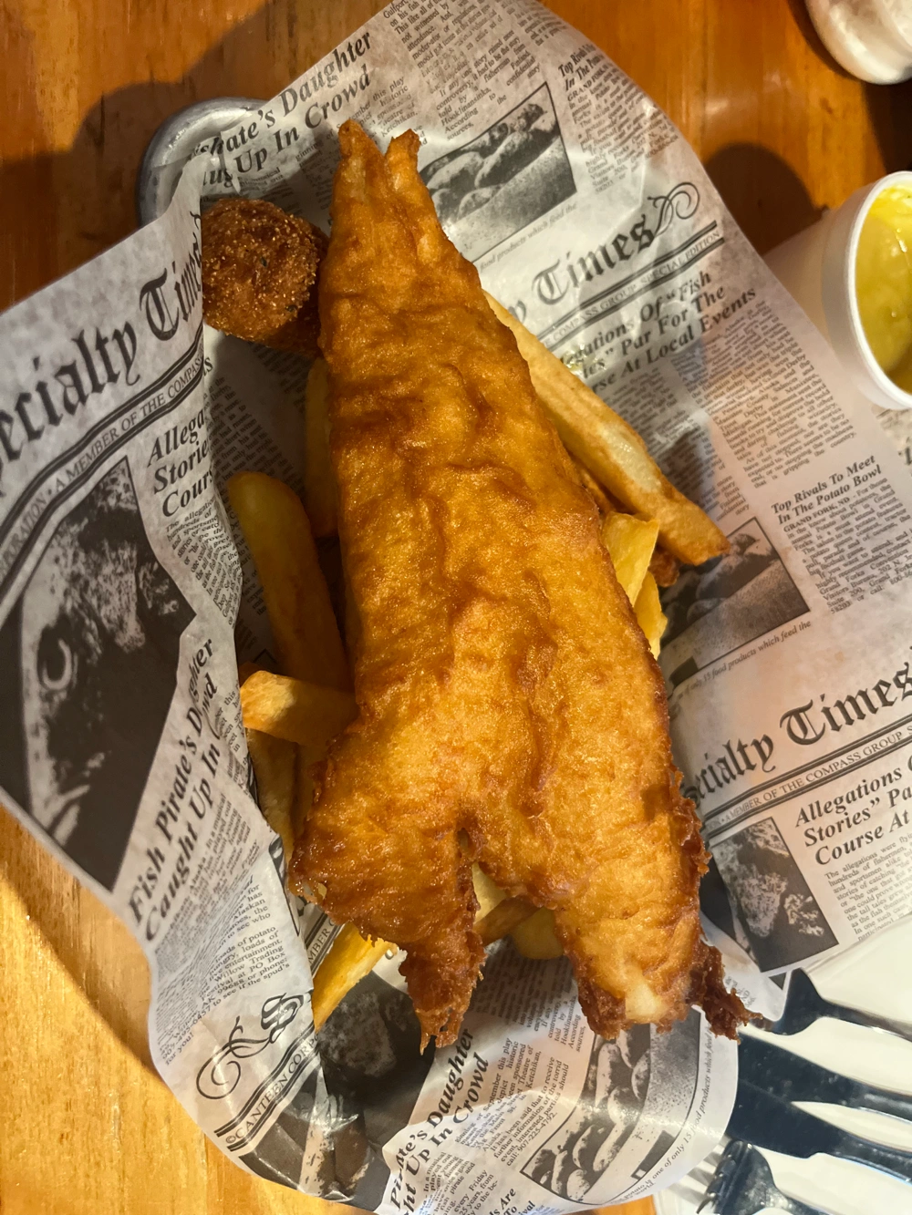 had a fun night out with my partner and best friend! we got the fried haddock with chips and tartar sauce, and for dessert a sticky toffee pudding. literally THE BEST fish and chips i’ve ever had the atmosphere was cozy and the staff were so pleasant. easily my favorite restaurant ever ♡