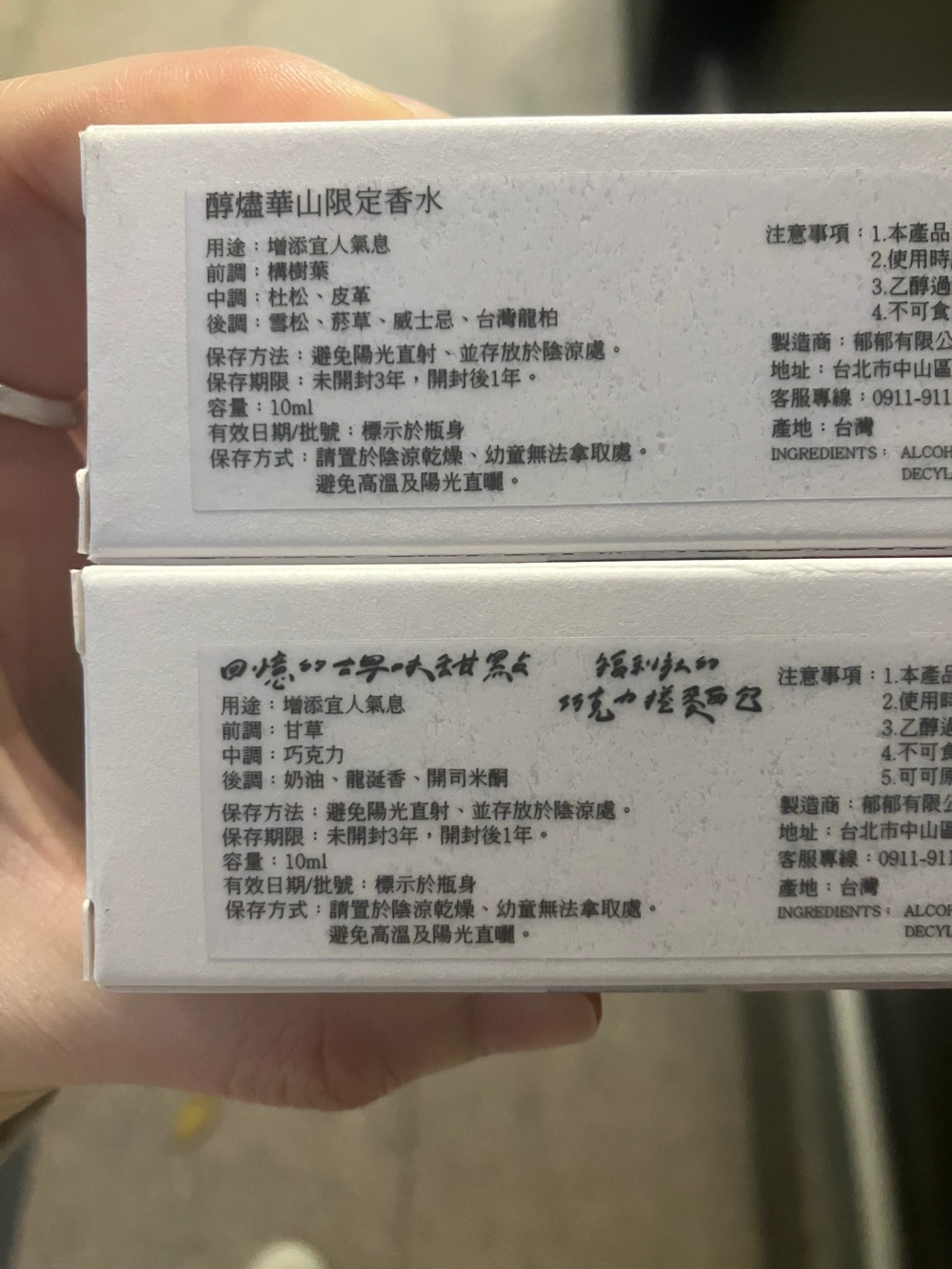 每次去華山都會經過郁郁,這次終於勇敢靠櫃試香 店員很熱情也很溫柔說每一支都可以試上身(我現在好香好喜歡😻) 有童年的香氣,也有臺灣的茶和山林的香氣 好喜歡,我怎麼這麼晚才認識他們!!! 後來選擇了限定款的巧克力麵包和華山限定的醇燼帶回家