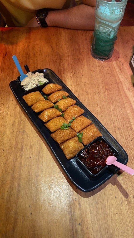 mêsversário de namoro e comemoramos numa hamburgueria temática que tem aqui na minha cidade. atendimento, experiência e comida impecáveis. lembrei de tirar foto apenas da entrada que pedimos chamada riivendell pillows (!!!!) perfeita. o nicholas gostou mais da maionese e eu gostei mais da geleia de pimentão que traz um ar agridoce e levemente apimentado. lá também tinha uma pessoa caracterizada de elfo 🧝que interagiu com a gente e tornou tudo ainda mais especial! amei amei amei!