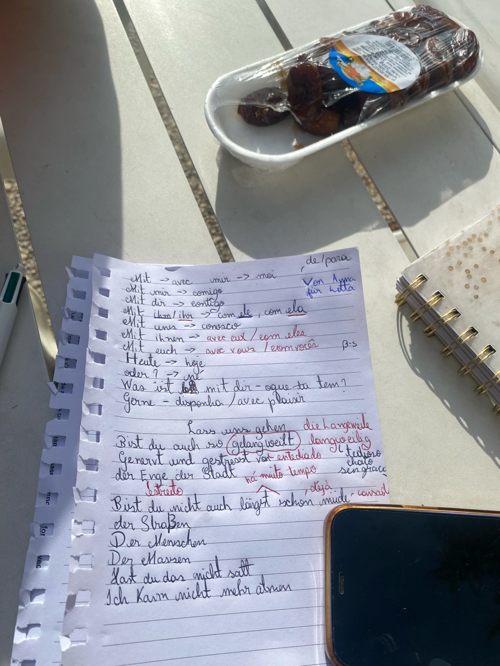 segunda aula de alemão e eu ja tinha esquecido todas as pronuncias, mas também peguei muito vocabulário (que eu ja esqueci tudo também🤠 por isso nao vou compartilhar aqui, hoje é so pra registrar a aula mesmo) p.s : esqueci de tirar a fotinha buaaa