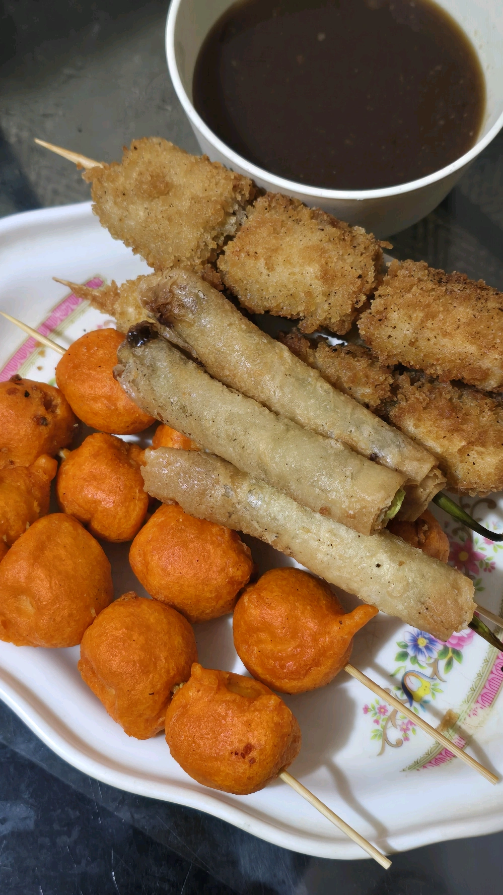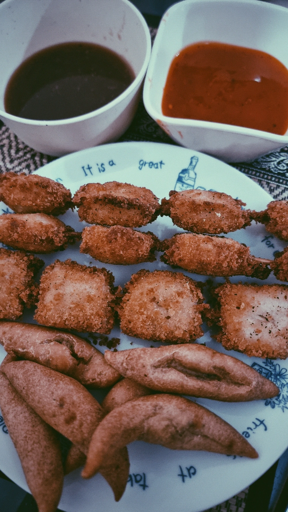 merienda: kwek-kwek, dynamiye, fried tofu