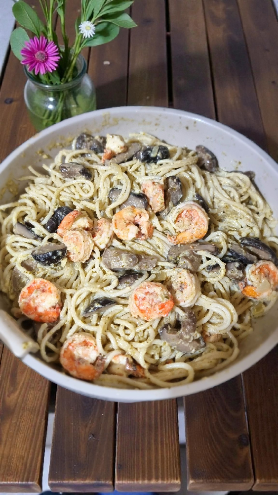 cooked creamy mushroom pesto pasta for dinner 🍴