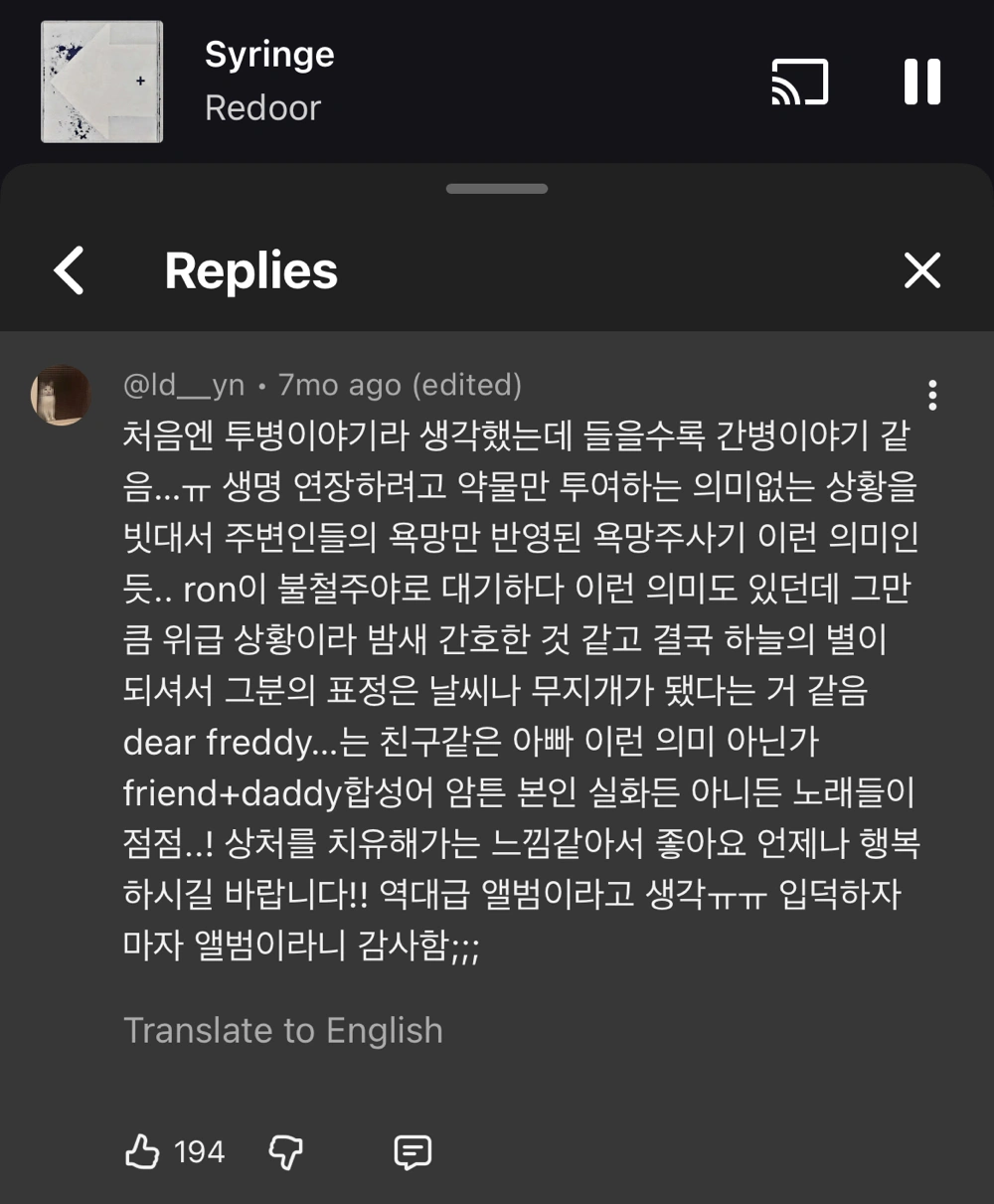 근 3일간 한곡재생 중 내가 나약한 인간에 불과하다는 것과 줄 수 있는 것 그 이상은 줄 수 없다는 것, 그 사실을 인정하고 내가 할 수 있는 것을 해야겠다는 생각이 들었다 사랑보다는 삶에 대한 마음가짐으로써 공감됐다 무엇보다 백예린의 목소리가 나를 울린다