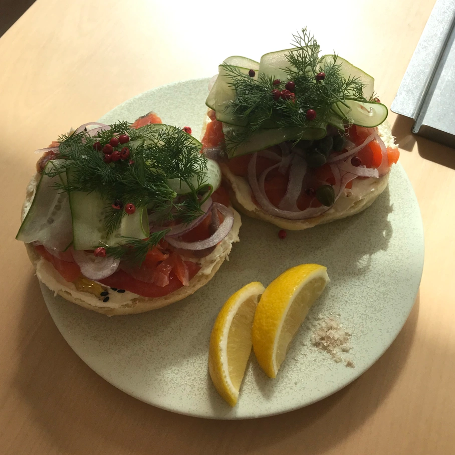 연희동에서 가볍게 브런치 먹을 겸 돌아다니가 들어간 베이글 카페 창이 엄청 크게 나있어서 햇빛이 들어오는데 기분이 너무 좋았다 그린 로스트라는 제철 채소가 들어간 메뉴를 주문하고 싶었는데 재료 소진인지 메뉴가 없어진건지 주문 불가능 하다 하셔서 살몬핑크페퍼로 주문했음 근데 주문하기 너무 잘했다는 생각이 들었음 연어에서 냄새도 안났고 레몬 뿌려서 솔트에 콕콕 찍어 먹으니까 너무 맛있었다..!! 밑에 발려있는 크림치즈? 같은 소스가 담백하고 맛나 조용히 작업하고 식사 하고 싶을 때 올 거 같다