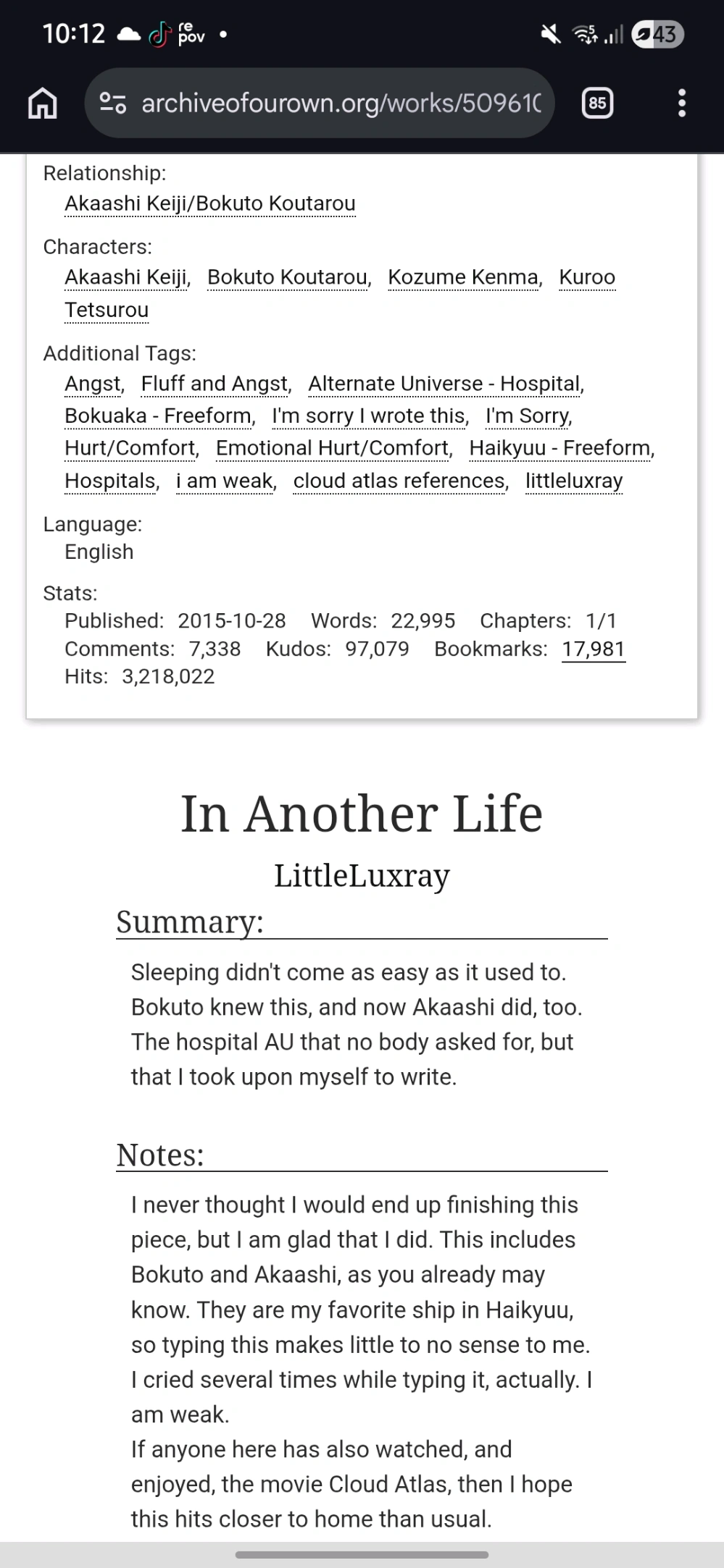 sedih banget anjir. In this universe akaashi and bokuto aren't in the same high-school and never played volleyball together. Akaashi met bokuto in the hospital and decided to visit him everyday. Akaashi was there until Bokuto's last breath. Seeing Bokuto's health slowly deteriorating hurts so much, I literally almost cried. YOU SHOULD READ THIS FANFIC.