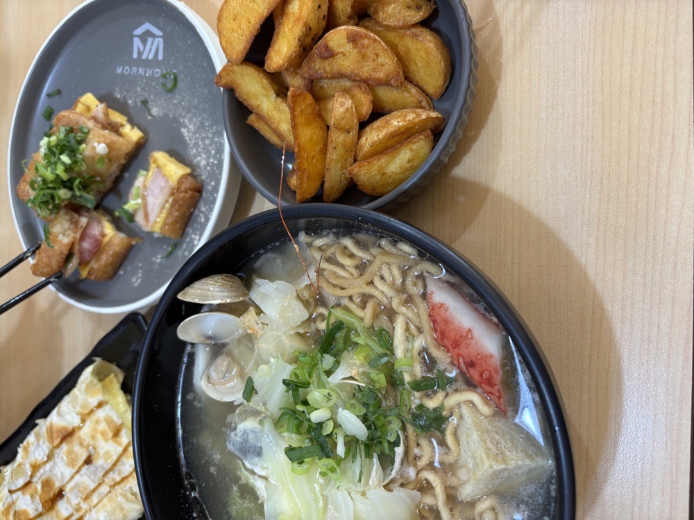 培根酥皮蛋餅|外皮小酥,但好像放一下就沒什麼酥了,中規中矩,培根稍油,整體偏油了點。 金磚蘿蔔糕|裡面是培根+起司,這個也稍油了點,那應該就是培根導致餐點都偏油。 帶皮薯塊|還不錯蠻脆的,讚讚。 海鮮意麵|海鮮就蝦子跟蛤蠣,都還不錯,菜也蠻多的,整體吃起來蠻滿足的。