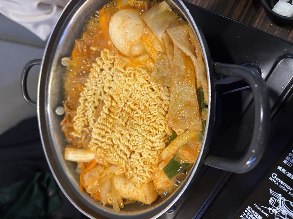 我們點的是 豬肉辣炒年糕&魚板+炸物+炒飯的套餐: 豬肉辣炒年糕|裡面本身就有附半塊的麵跟一顆蛋,剩下的就是豬肉年糕跟泡菜,辣度選小,基本上沒什麼辣度偏甜,整體還算不錯吃,不會過鹹。 魚板|一份兩隻還不錯吃讚讚。 炸物|選擇金馬利,就是海苔冬粉卷,有點油味,然後沒有沾醬可以沾,只好沾鍋的湯汁來吃比較好吃。 炒飯|吃到最後服務生會把鍋拿去加飯,偏濕,量應該有一碗半到兩碗的份量。 上面整體吃完算蠻好吃的,份量也還算夠,值得嘗試的一家店。 後話:原本以為裡面沒有麵我又加點了起司麵,結果來了一碗泡麵上面就蓋了一片起司,湯一咪咪的奶味但不明顯,不太好吃,後面都是把麵撈出來沾著鍋的湯來吃,明顯有味道很多,不然原本太淡,就只有這碗的價格130我認為偏貴偏不值得,我寧願鍋加點麵🥲