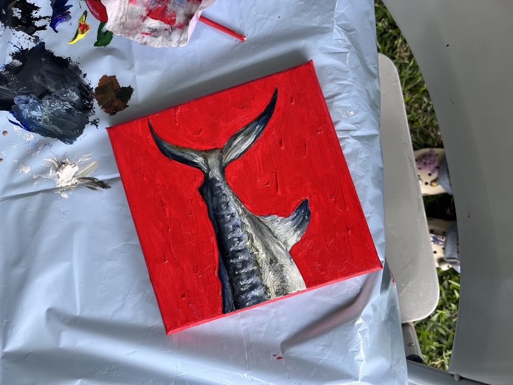 Fueron 3 horitas y media que estuvimos ahí, de las cuales cm 2,5 tardé en hacer la cola de pescado jshdjs, mi amix si duró un poco más(ya que nunca había pintado) y estuvimos a punto que nos echaran jahdja. Igual pasaron otras cosas cómicas en el proceso de nuestras obras: primero fueron las toallas extra grandes q nos dieron para quitarles el exceso de pintura a los pinceles JDHSJ. Realmente no creo q las hayan comprado para ahorrar, porque un paquete de servilletas cuesta menos, pero fue muy gracioso como solo nos las dieron sin contexto, y aparte fueron bastantes bondadosos, porque nos dieron dos a cada persona. Aunque cabe destacar que sirven muy bien para el propósito que las compraron xd. En segundo lugar, también relacionado a las toallas, dos personas llegaron tarde y preguntaron por servilletas, las cuales les negaron pq no habían. Un rato más tarde sentí un fijada puesta en mi y luego de un minutos me empezaron a llamar, me dí la vuelta y eran ellos viendome con una cara así 🤨🤨. Me preguntaron que si lo que estaba usando para limpiar los pinceles era una toalla y les expliqué la situación, al final me terminaron pidiendo la toallita que me sobró JDHSAJSH.