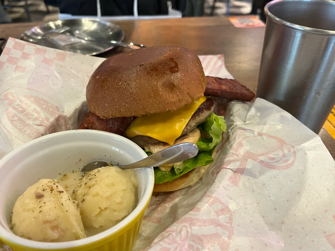 中等偏高價位的美式漢堡 非常好吃 我點的是含一塊超厚培根的漢堡 麵包起司生菜的品質都不錯 白醬薯泥有夠好吃 裝潢是美式餐廳風格 但是店內油煙味蠻重的