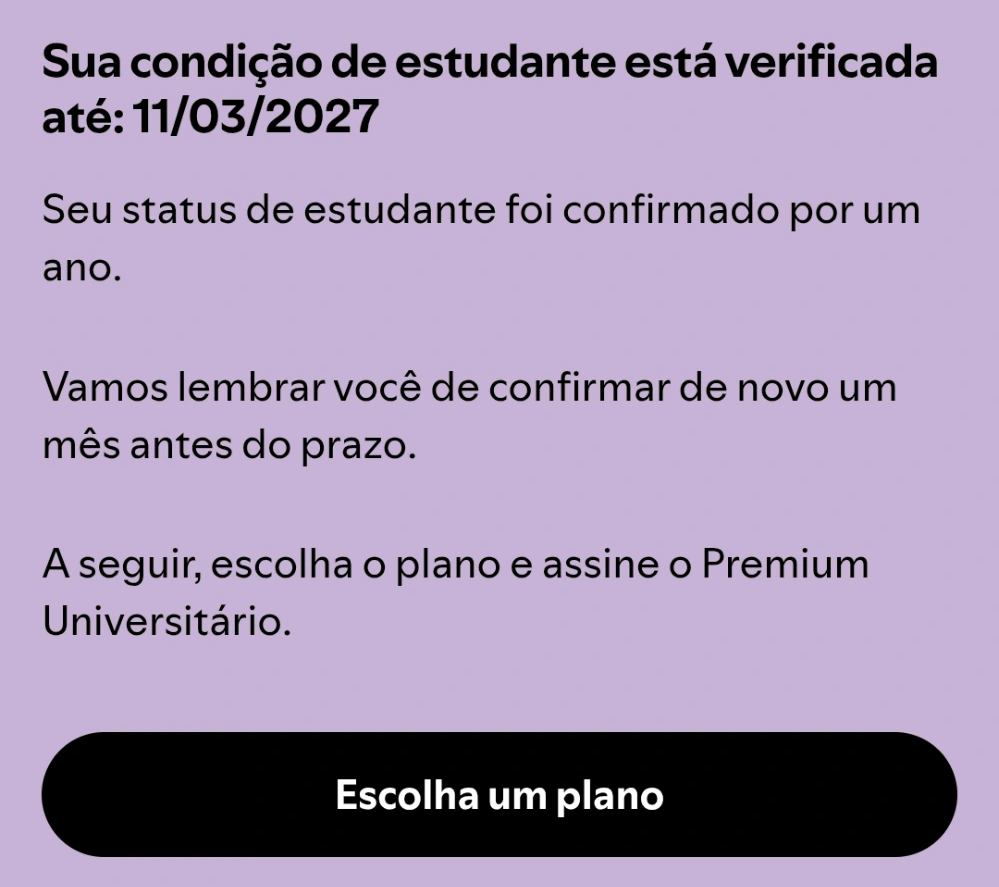só agora eu consegui o spotify universitário depois de quatro anos de faculdade e finalizando esse ano, mas não importa pois vou aproveitar cada minuto e centavo economizado