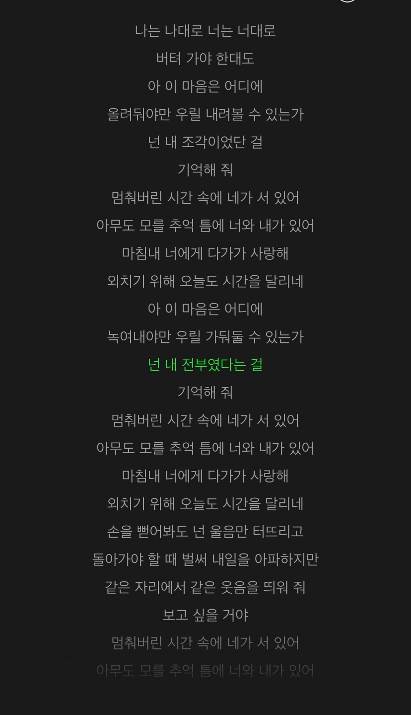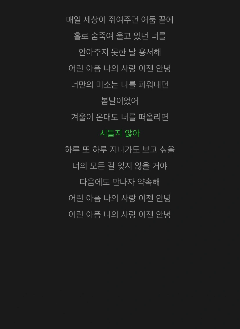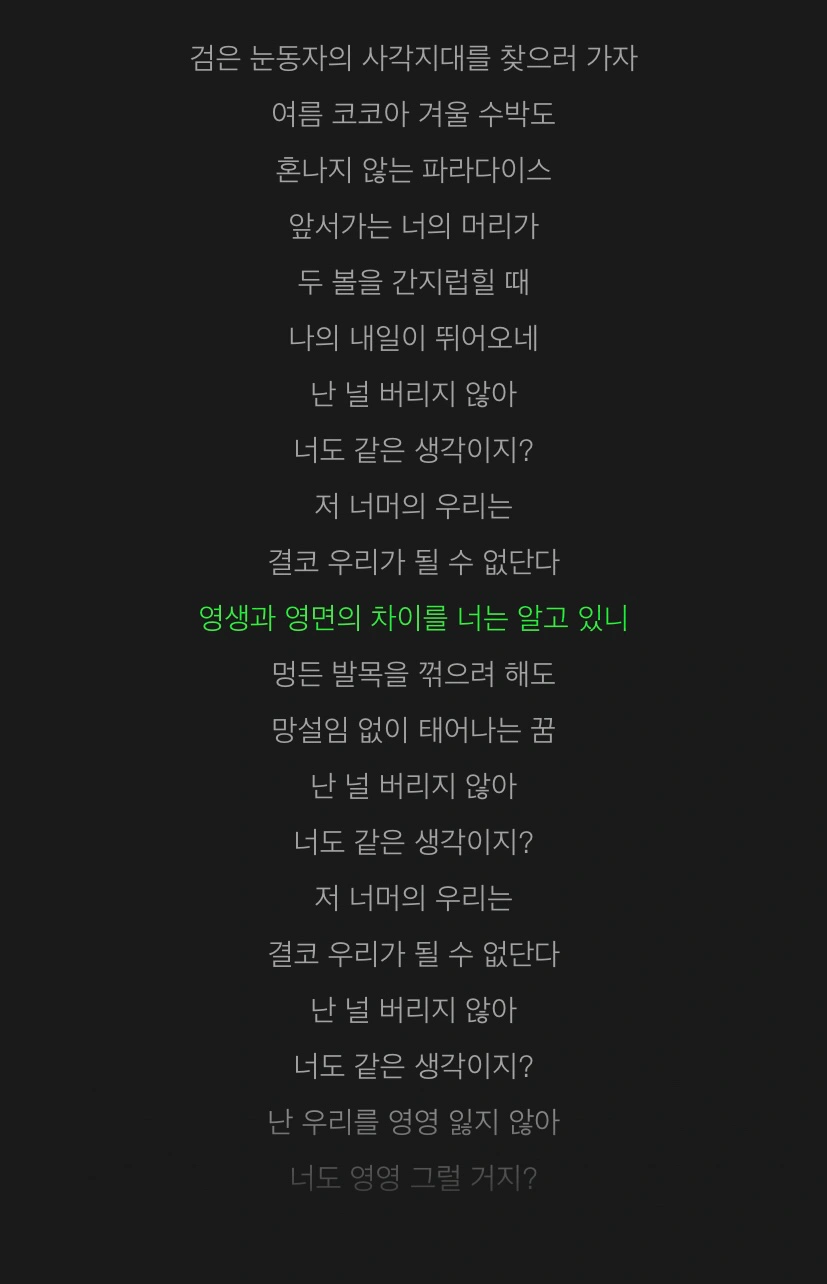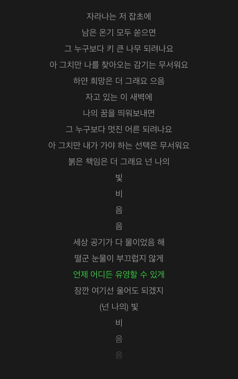 자라나는 저 잡초에 남은 온기 모두 쏟으면 그 누구보다 키 큰 나무 되려나요 아 그치만 나를 찾아오는 감기는 무서워요 하얀 희망은 더 그래요 으음 자고 있는 이 새벽에 나의 꿈을 띄워보내면 그 누구보다 멋진 어른 되려나요 아 그치만 내가 가야 하는 선택은 무서워요 붉은 책임은 더 그래요 넌 나의 세상 공기가 다 물이었음 해 떨군 눈물이 부끄럽지 않게 언제 어디든 유영할 수 있게 잠깐 여기선 울어도 되겠지 (넌 나의) 빛 비 음 음 ↳그저 빛..... 0+0, 갈림길 ㄹㅈㄷ!!