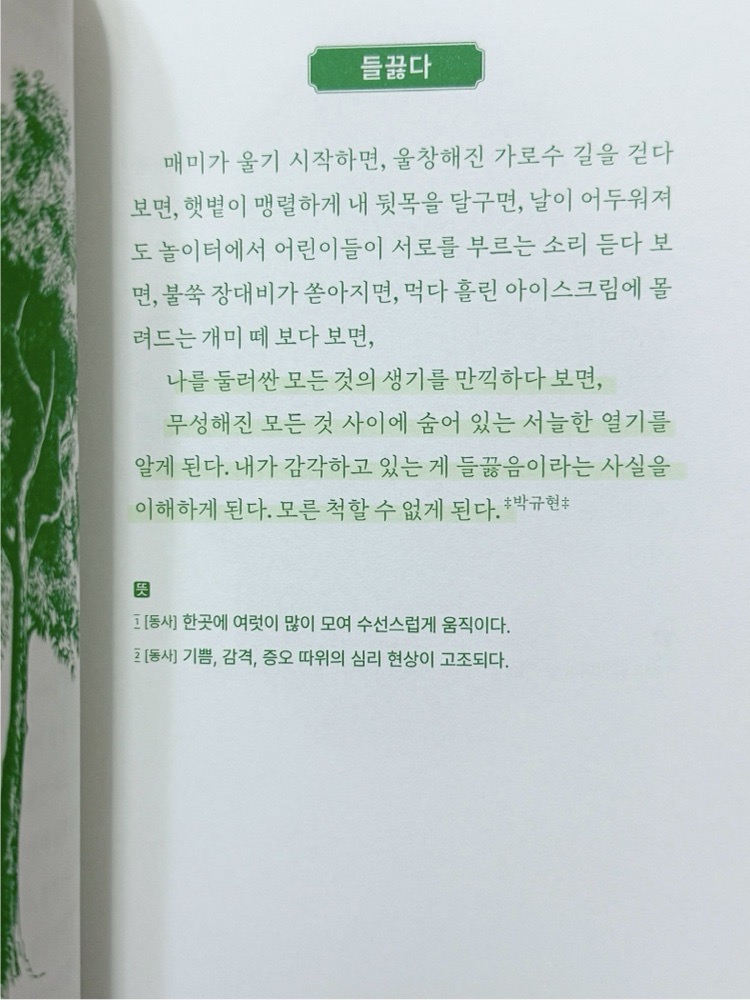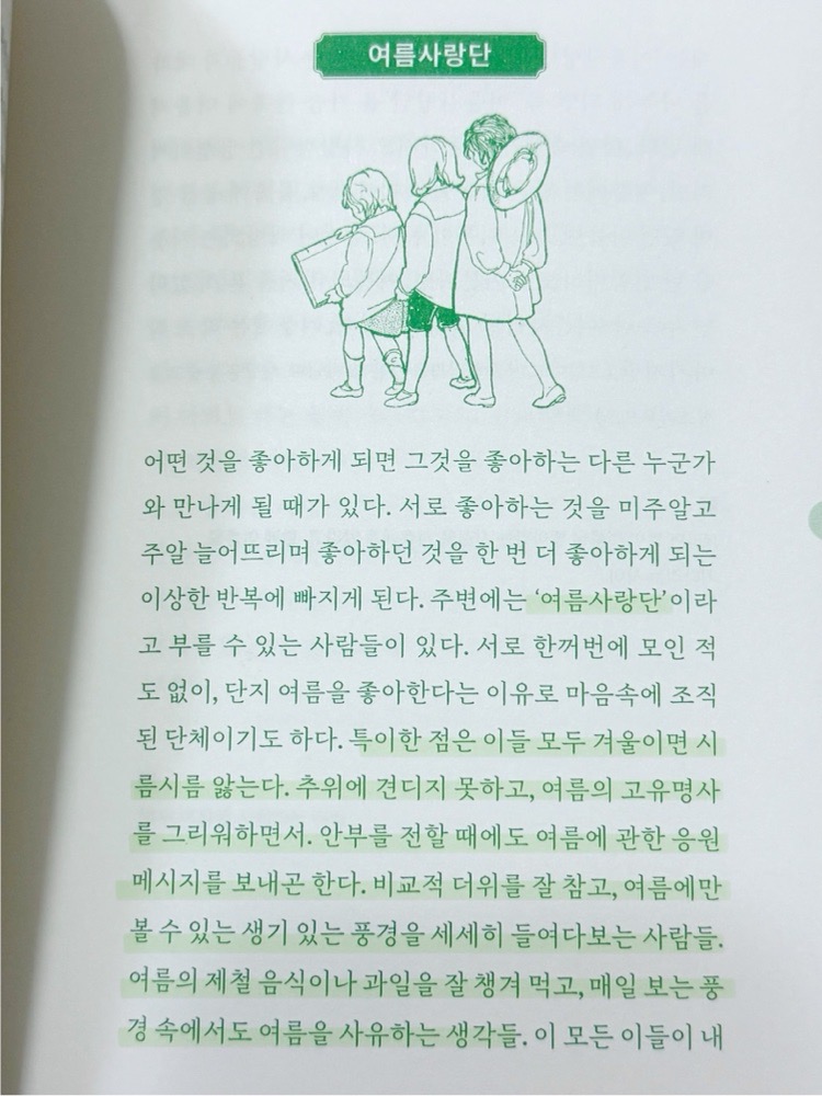 역대급 내 취향 책 🌿🧊 여름사랑단? 그게 저예요 157개의 여름 단어를 수많은 시인들이 각자만의 이야기로 표현한 기획부터가 완벽히 내 마음에 꽂힘.. 그리고 저 157개의 여름 단어 사이에 ‘크리스마스’가 끼어있는 게 너무 귀엽고 웃겼다..ㅜ 작가들이 한데 모인 책인데 누구 하나쯤은 통통 튀어야지 책에 나오는 단어 중 좋았던 단어는 ‘고양이자리‘, ’긴긴해‘, ‘나무말미‘, 빛나다‘, ‘시폰케이크’, ’여름사랑단’, ‘여름잠’, ‘찬란하다’, ’클로티드크림‘, ‘풋사랑’. 내용이 좋았던 파트는 정말 많다.. 겨울어 사전도 엄청나게 기대 중.. ෆ 여름어 사전에서도 겨울 얘기가 꽤 나왔으니 겨울어 사전에서도 분명 여름을 그리워하고 있겠지 청개구리들