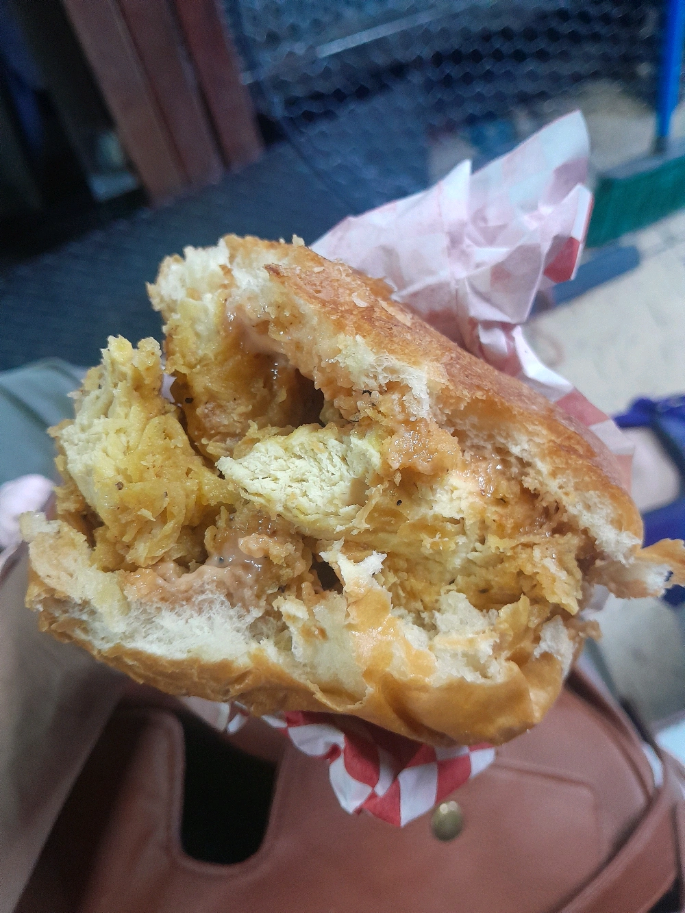 No es la foto más estética, pero la hamburguesa era muy rica, el pollo tenía un sabor a pimienta muy agradable y era muy crujiente. Estoy segura que con alguna de las salsas que ofrecen en el lugar hubiera sido un 5 de 5 ✨️