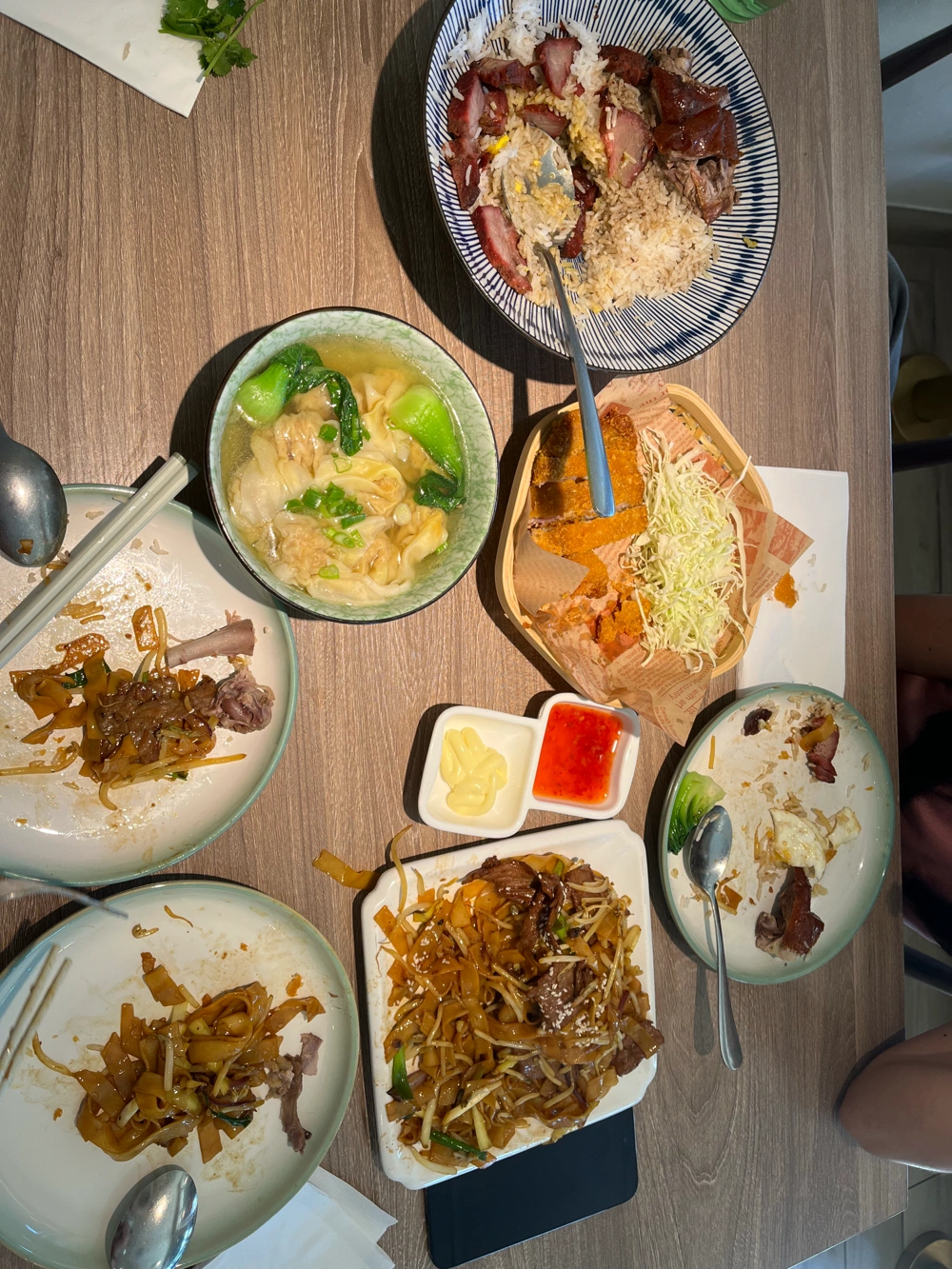 honeslty i was not expecting it to be this good considering it looked like a modern millenial cafe where everything is priced at $30 but it was actually really good and authentic hk food -from top to bottom -- bbq combo rice (duck and pork) -- shanxian wontons -- fried porkchops -- beef fried rice noodles all fire (excpet the porkchops werent to my taste but still good)
