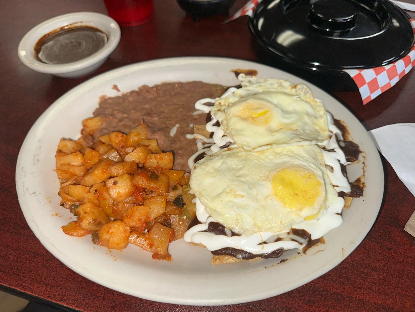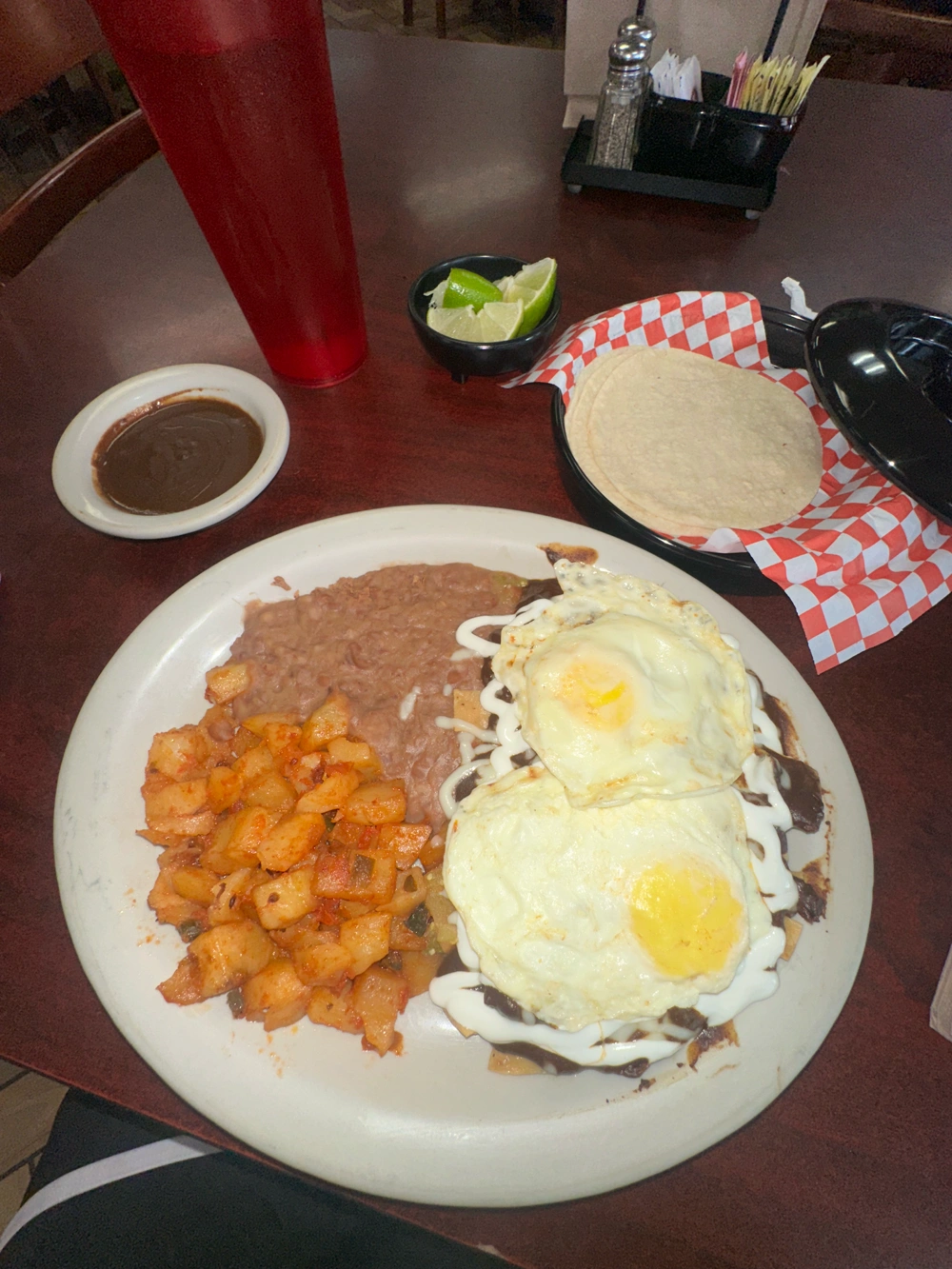 Crispy corn tortillas topped with shredded chicken, green salsa or red salsa, mozzarella cheese, crema, onions. Served with papa a la mexicana y beans that’s the description from the menu, but what i did was ask for mole sauce instead of red or green salsa because when i went to cancun with my parents one year, the resort we stayed at had this dish they called ‘enmoleadas’ and i believe it was basically chilaquiles de mole and i became obsessed. literally when we got back home, i went on tiktok and looked to see how i could make it. there wasn’t a clear recipe for me to follow so i just freestyled with frying corn tortillas, heating up ready made mole sauce from the store (brand doña maria) and adding chocolate because i love chocolate, adding shredded rotisserie chicken because i love rotisserie chicken AND fire source of protein, then combining everything until it’s coated through. sometimes ill scramble eggs with everything for extra protein and filling.