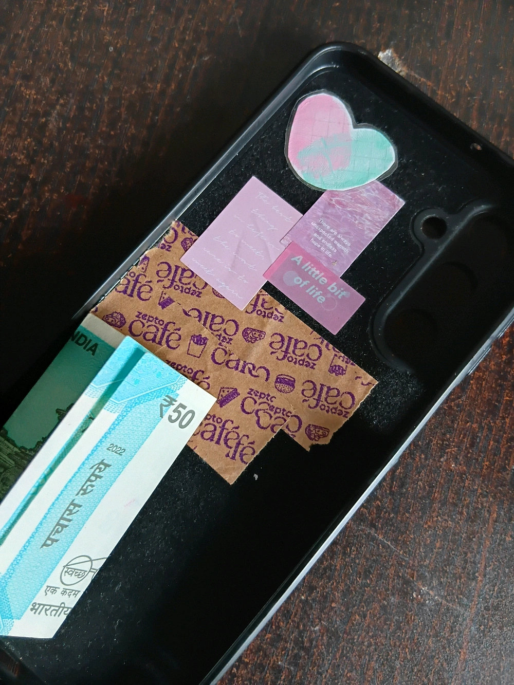 this what the back of my phone case contains, honestly it's missing a tiny bi flag, gonna sort it soon 🍩🫡