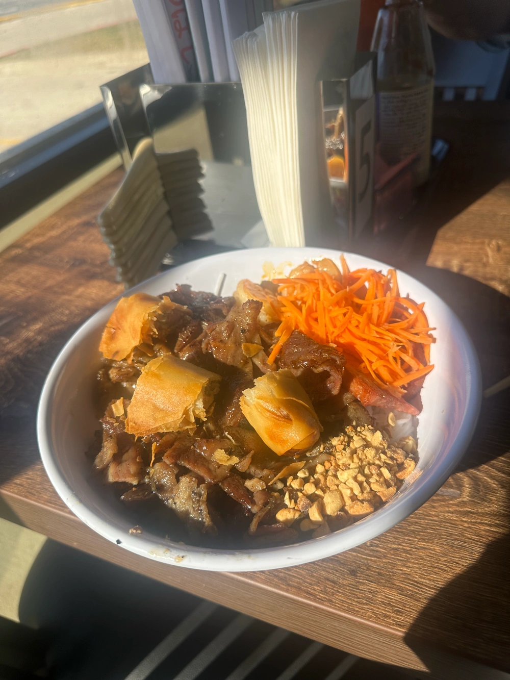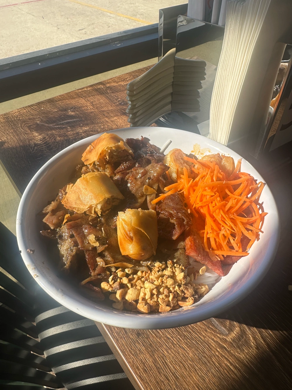 from my favorite viet place that i’ve been going to for 10+ years now, at this point. this is the house special vermicelli noodle bowl with thit nuong/grilled pork, nem nuong/grilled sausage, cha gio/eggrolls, tom/shrimp, pickled carrots and peanuts. it usually comes with lettuce and cucumber, but i ask for the bowl without it. then you pour fish sauce over it, mix and munch ! i can taste this bowl in my mind and even after living in houston, i can’t find a place that makes it taste like this or have a portion this size for the price as well. we love smol businesses.