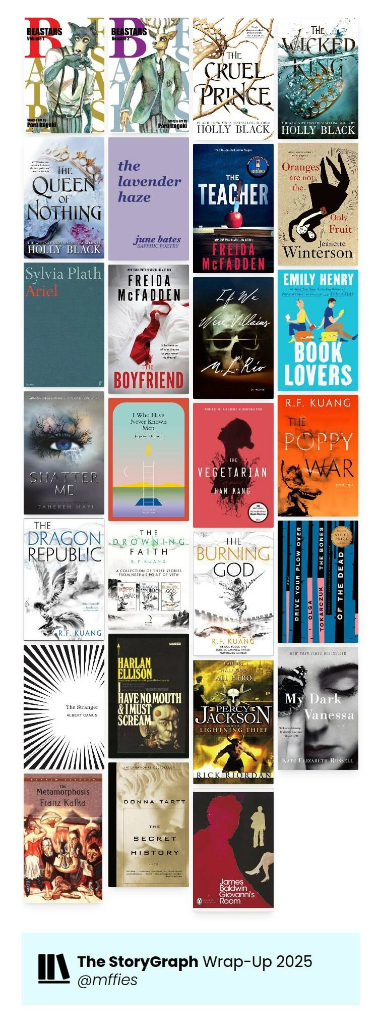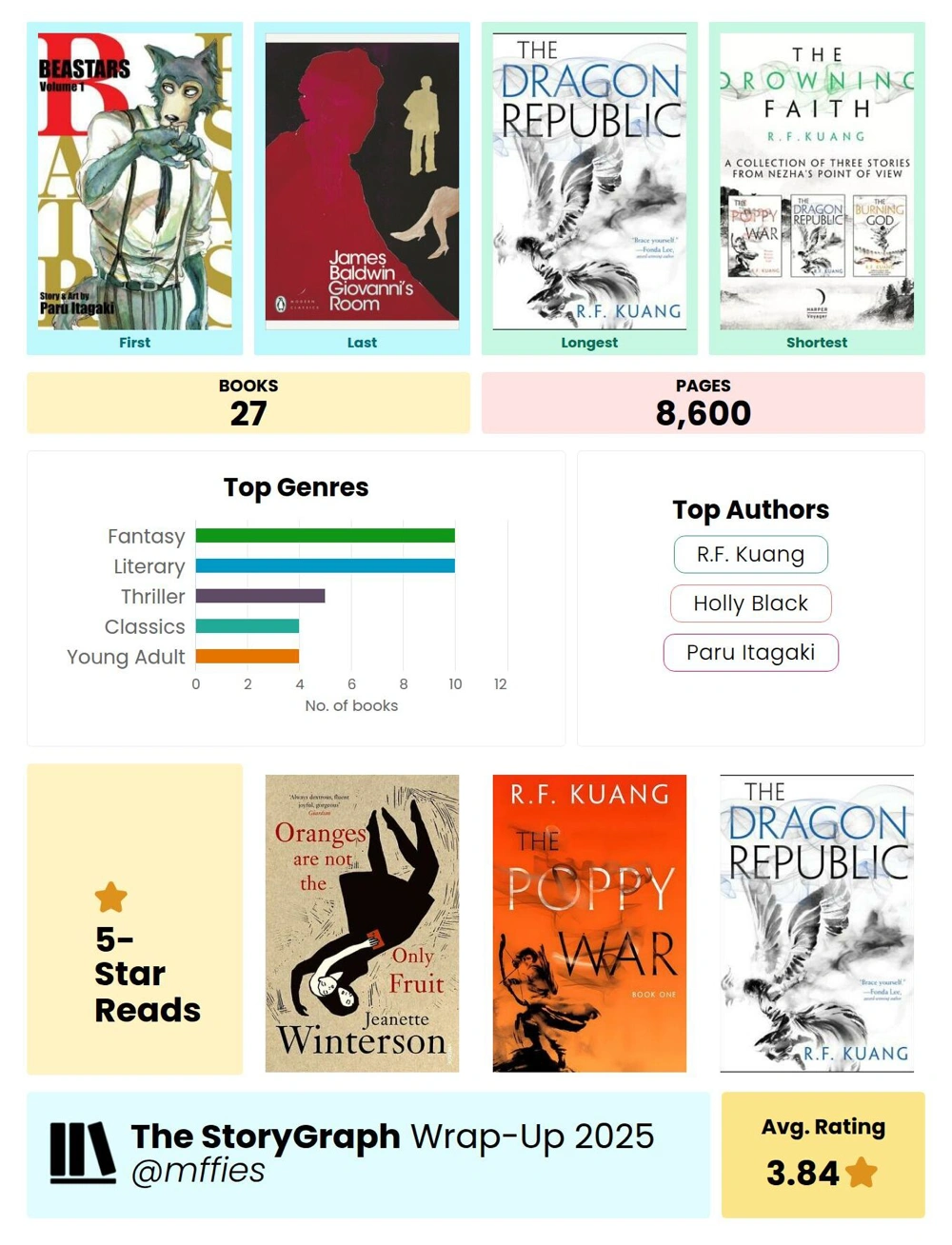 i read twenty-seven books last year. i’m proud of myself. i read books i enjoyed, i read some books that i did not enjoy as well. i have found my ultimate taste in books, as well as some of my new all-time favourites that i still think about. i’ve added the pictures of my reading data for 2025 if anyone’s interested.