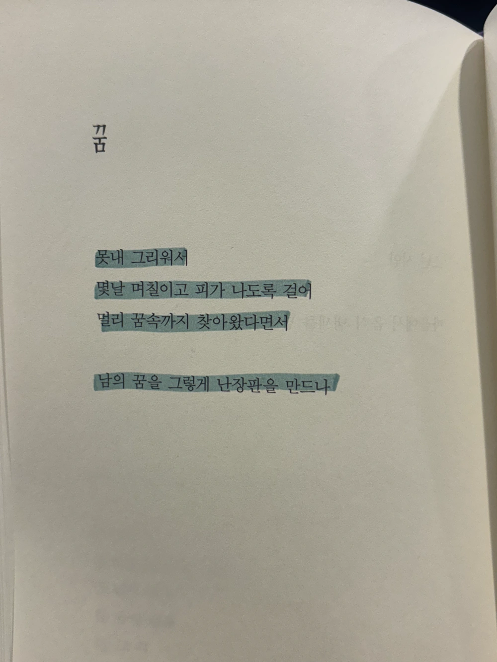 못 내 그리워서 몇 날 며칠이고 피가 나도록 걸어 멀리 꿈 속까지 찾아왔다면서 남의 꿈을 그렇게 난장판을 만드나