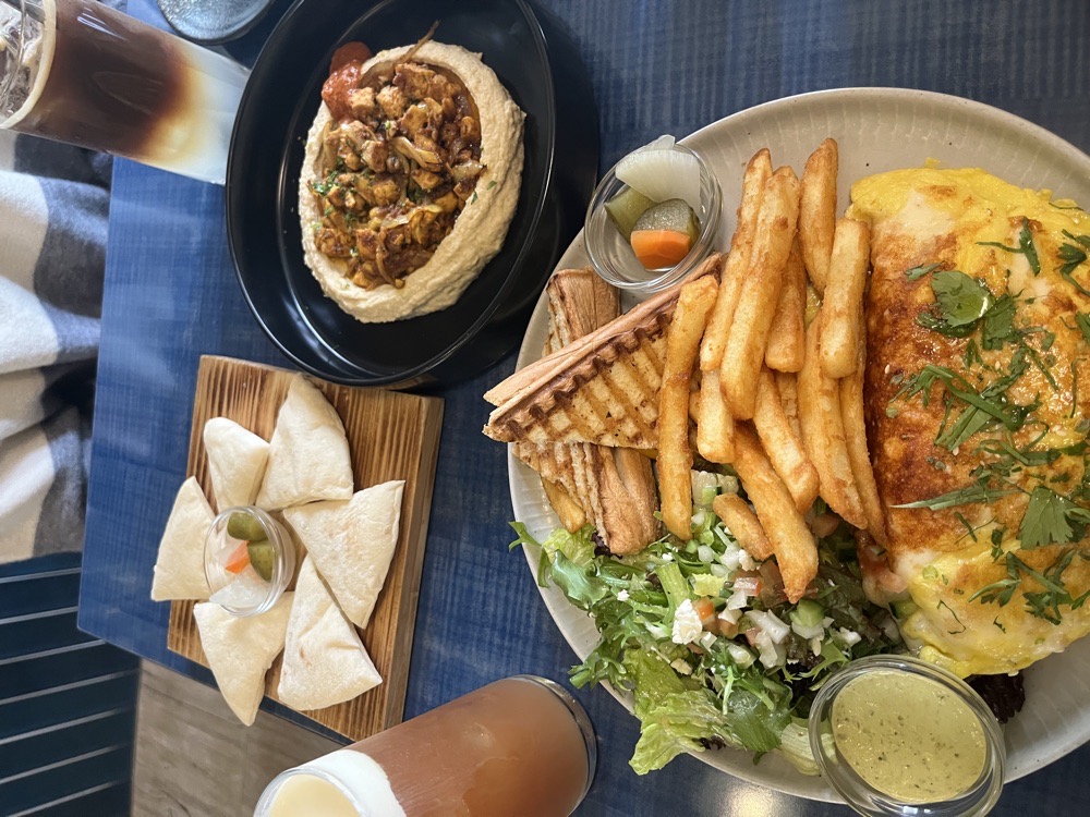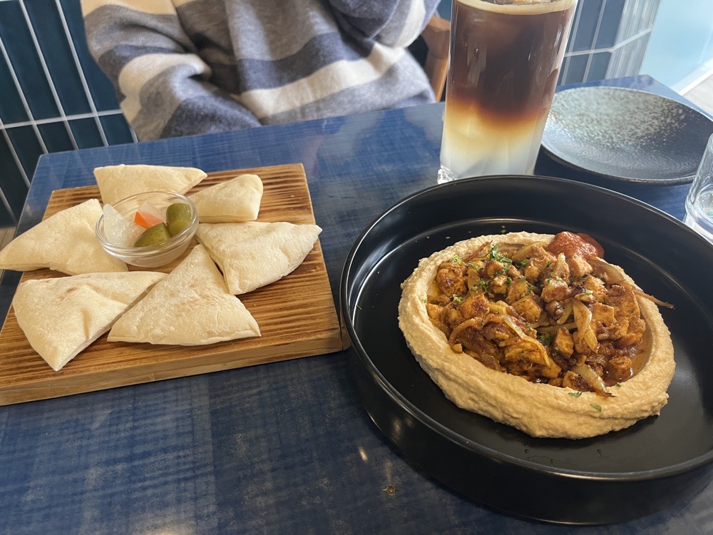 第一次吃地中海料理,餐廳店員每個都很親切 整體用餐環境就是很chill的那種 重點食物也非常好吃 這次點沙瓦馬雞肉胡姆斯,就是餅皮夾鷹嘴豆泥跟雞肉,口味很棒整盤吃光光 還有點一份歐姆蛋早午餐,從歐姆蛋、帕尼尼到生菜都好吃,生菜的淋醬也是清爽的那種 啊...最後招待的番茄汁我個人不是很愛,不過是送的就沒關係 還好我們有點伯爵奶蓋跟西西里咖啡都是好喝的 總結之後可以再來很多次~體驗不一樣口味的料理, 看能不能無痛轉當地中海居民~