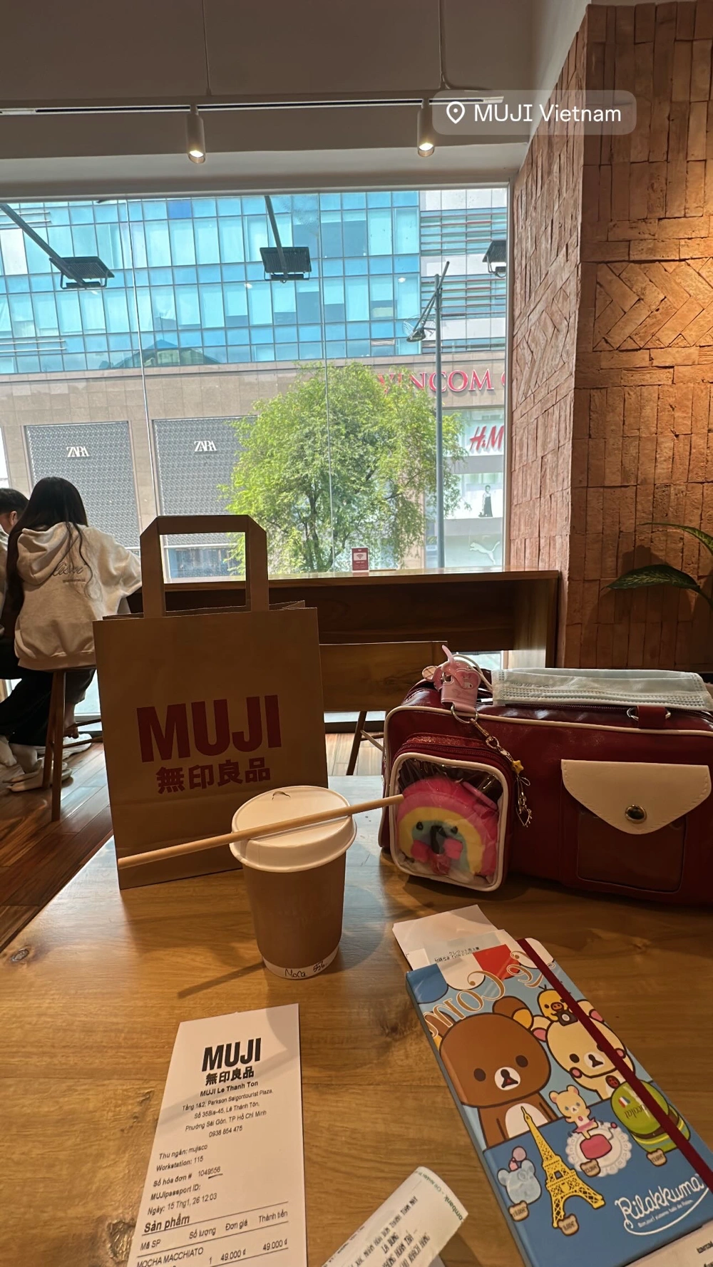 i’ve been in vietnam about a week and a half now at this point and it’s been a ride. i actually decided to go to muji on this day because one of my tiktok mutuals posted about her haul from her philippines travels and she went to muji. being from texas, we don’t have muji so this was my first time ever being in one. it was two stories and had so much r that i didn’t even look at because i got anxious and overwhelmed. i mostly shopped upstairs where the stationery was since that was my main goal. at the cafe, i ordered a mocha macchiato, which i totally didn’t spill. with my coffee, i sat down and journaled with the paper muji bag i got and paid for and with receipts i had that were waiting to be memorialized. a few selfies for good measure..