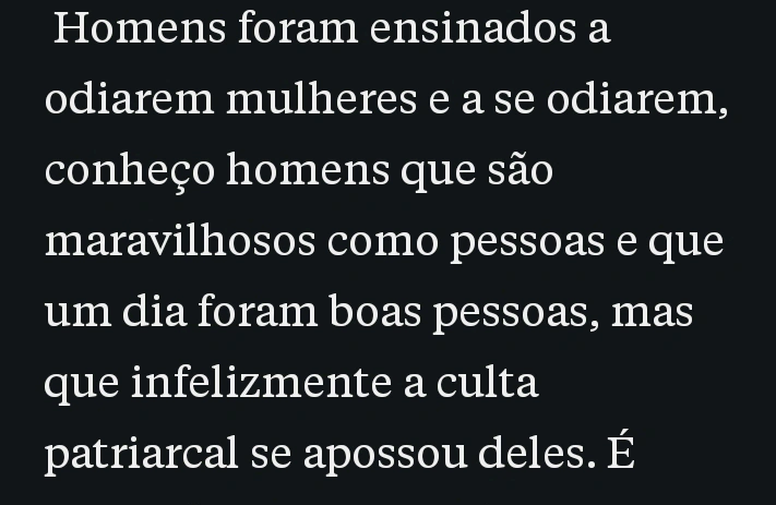 Tava lendo um texto no subtack (não recordo o título agora mas se interessar deixo o link nos comentários) e depois de uma ruptura que tive com um "amigo" cheguei numa conclusão que, todos os homens que se odeiam consequentemente odeiam mulheres e isso é fato! Tenham medo de homens que abertamente admitem não terem o mínimo de auto respeito pois eles também não possuem auto controle. Infelizmente muitos rapazes com um puta potencial se perdem no próprio odio.