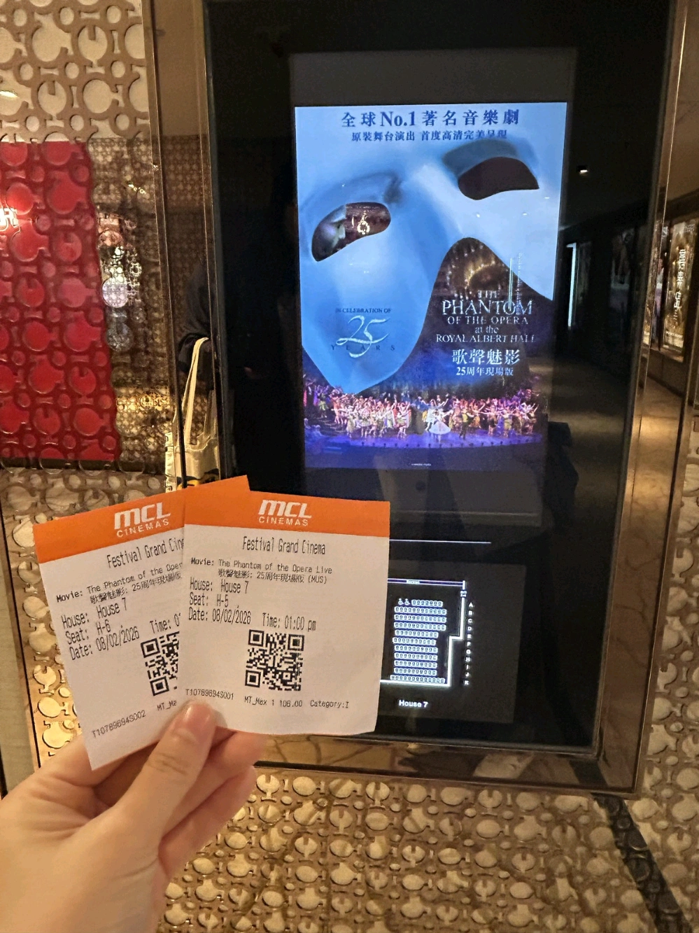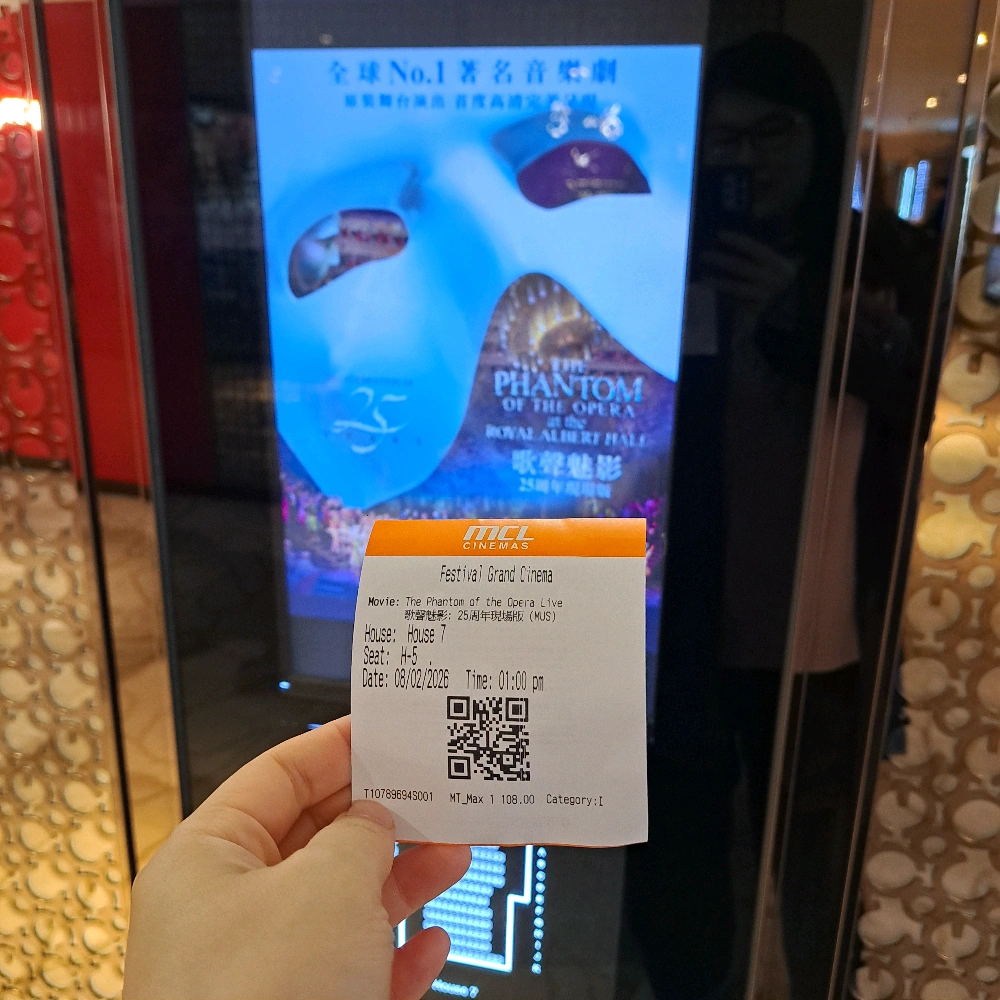 第1次睇歌聲魅影, 第1次係戲院睇舞台劇,幾唔錯! 套劇本身好睇精彩!經典歌好好聽! 魅影好有魅力,最後同女主角嘅對手戲好感人,兩位演員都好正! 然後25周年最後謝幕,有初代克莉絲汀同魅影嘅演員登場,初代女演員獻唱之餘,仲有五代魅影合唱,好感動。