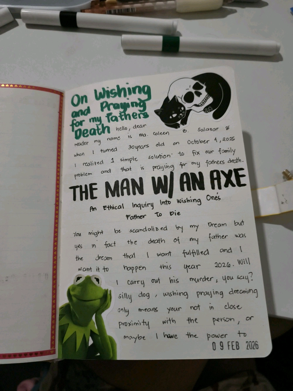 3rd day of work week It was raining 🌧harrd. i slept around 5.30am woke up at 9.30am but slept again because of the fuzzy cozy feeling of the rain the woke up at 12.50pm prepared for work. i took a taxi huhuhu theres no public transportation maybe because of floods. it wasss 🥶 but still was glad! now 11.56pm got home and will do journaling. ive got and idea about exploring my thought process of wishing death upon a father lol.