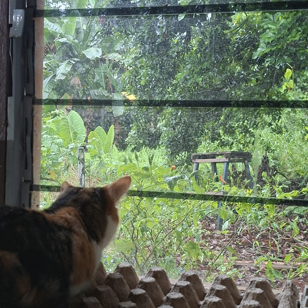 her chicken is still hot so i didn't gave it to her and she decide to look outside sulking