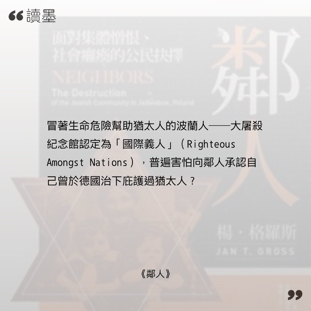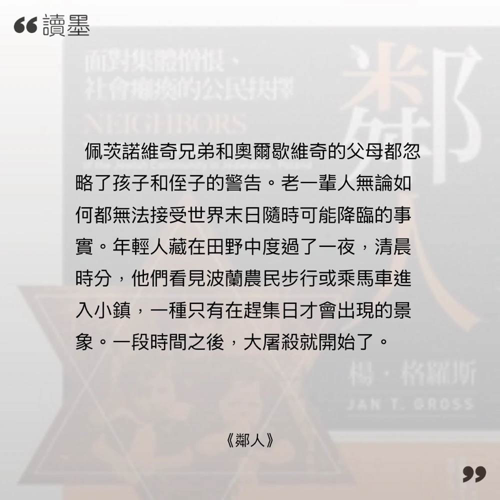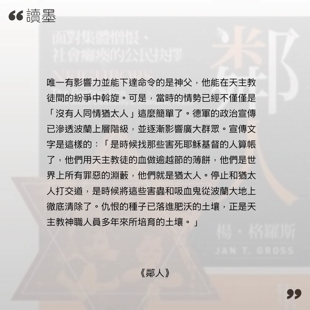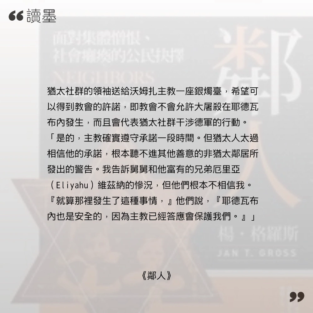 本書有啲沉重。令我思考如果係個個情況下,我會唔會有勇氣去叫人走。良心同自己條命,邊樣重要啲?道德高地嘅說話人人都識講,但我有冇辦法、勇氣,唔加入呢啲所作所為? 本書雖然係講猶太人屠殺,但係唔係講德國人,而係講波蘭人。 一個在波蘭的鎮,一半係猶太人、一半波蘭人,兩方相安無事咗5百幾年,點樣在無德國納粹黨強迫之下,波蘭人自發殺咗人地全家,成個鎮一半人口。但明明前幾日,仲可以互相交換物資。 本書利用當年嘅證詞、好彩逃離到嘅當事人嘅回憶,去講返事件。(不過,作者都好公平咁講,證詞嘅限制,例如:當年調查人員對案件唔重視,令證詞有矛盾、受害人數數字矛盾、有可能屈打成招,調查時間短)所以作者用咗大量嘅資料去交叉比對。 令人覺得驚訝嘅係,本書岀嘅時候(十幾年前?),當事人仲未死,加上大量資料比對,值得採信。在波蘭政府主導之下,有相關嘅悼念活動、宗教彌撒,個個鎮嘅居民(波蘭人)堅決否認相關指控,更阻礙活動進行,阻礙者包含天主教方人士。 令我當頭棒喝,何謂良心。 睇到後段,見到好人無好報,有啲波蘭人幫咗猶太人,但係佢就比波蘭人排斥,要搬屋,搬完一間又一間,連下一代到受影響。 做咗正確嘅事,可惜無正義嘅果。