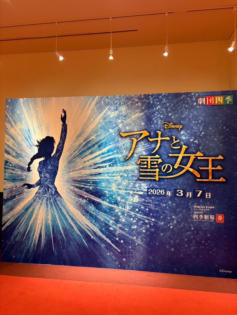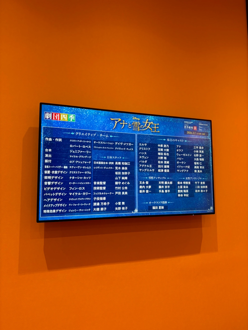 大感動。 オリジナル曲多かった!映画版からの編曲がとても良かった、特に扉開けて。 基本的にディズニー作品は英語音声大好き人間で、金髪のお姉さんが明らかに日本ではない土地で日本語ペラペラ喋るのが受け付けないタイプ。でも、アナ雪に関しては小学生の頃日本語で散々みてたから、自分の中で違和感なく、なんならすんなり入ってきたから、めっちゃちゃんと楽しめた良かった。 1幕どう終わらせるんだろって思ってたら、技術の凄さに感動する神演出からの、めちゃくちゃかっこいい締め方で本当に鳥肌たった。全編通してここが一番良かった。エルサの衣装チェンジ、噂には聞いてたけどほんっとにすごい。 イマイチだったとこを強いて言うなら、アナとエルサの子役の子たちの演技💦ミュージカル特有の喋り方を意識し過ぎて??誇張感が強いと言うか、すごく不自然な話し方に感じた💧 だからこそ、その後のアナ役の方の演技と歌のうまさに本当に圧倒された。言動がアナすぎて泣きそうになっちゃった。 パンフレットにも書いてあったけど、やっぱミュージカルって、作品も、キャラクターも、自分も「生きてる!」っていう実感がめちゃくちゃ得られて良いんだよねーー大好き。