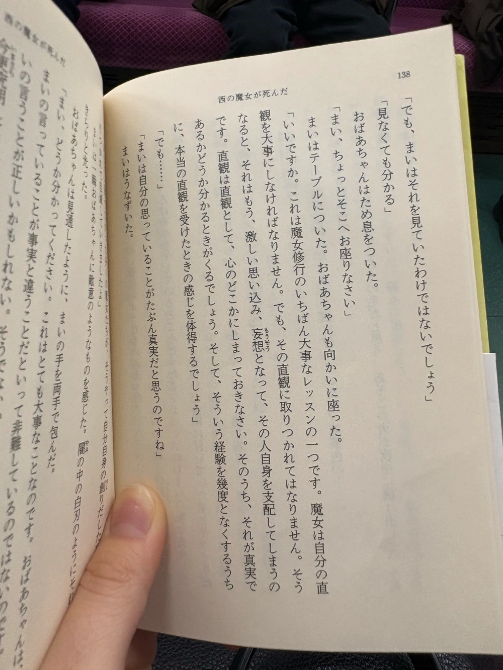 読みながら、おばあちゃんのこと思い出した。ガーデニングをしてていろんな知恵を教えてくれたり、手間がかかった美味しい料理を作ってくれたり、落ち込んでる時魔法みたいな言葉をくれる。主人公のマイと同じように、わたしにとっても、おばあちゃんってなんだか魔女みたいな存在だったなって思った。懐かしくて、寂しくて、泣きそうになった。 おばあちゃんの、 意思を持って自分のやりたいことをやる 自分の直感を持っているのは大事。でも信じ過ぎない 自分が自分らしく、楽しく居れる場所を選ぶのは逃げじゃない っていう教え、とても素敵だし、救われるなって思った。わたしも「魔女の訓練」しよ。 読書の良さって、その本の物語自体に自分の経験を重ね合わせられることな気がする。映像がなくて、文字だけだからこそ、思い浮かべる光景はたぶん自分が見たことあるモノ、経験したことあることに基づいてる。自分のペースで読めるからこそ、文章から自分の経験とか思い出を掘り起こすことができる。読書って物語を楽しむことでもあるけど、自省の時間でもあるんだなって思った。とても素敵。気づくのが遅くなっちゃったけど、まだ20代のうちに気づけてよかった。たくさん本読みたい!!!!