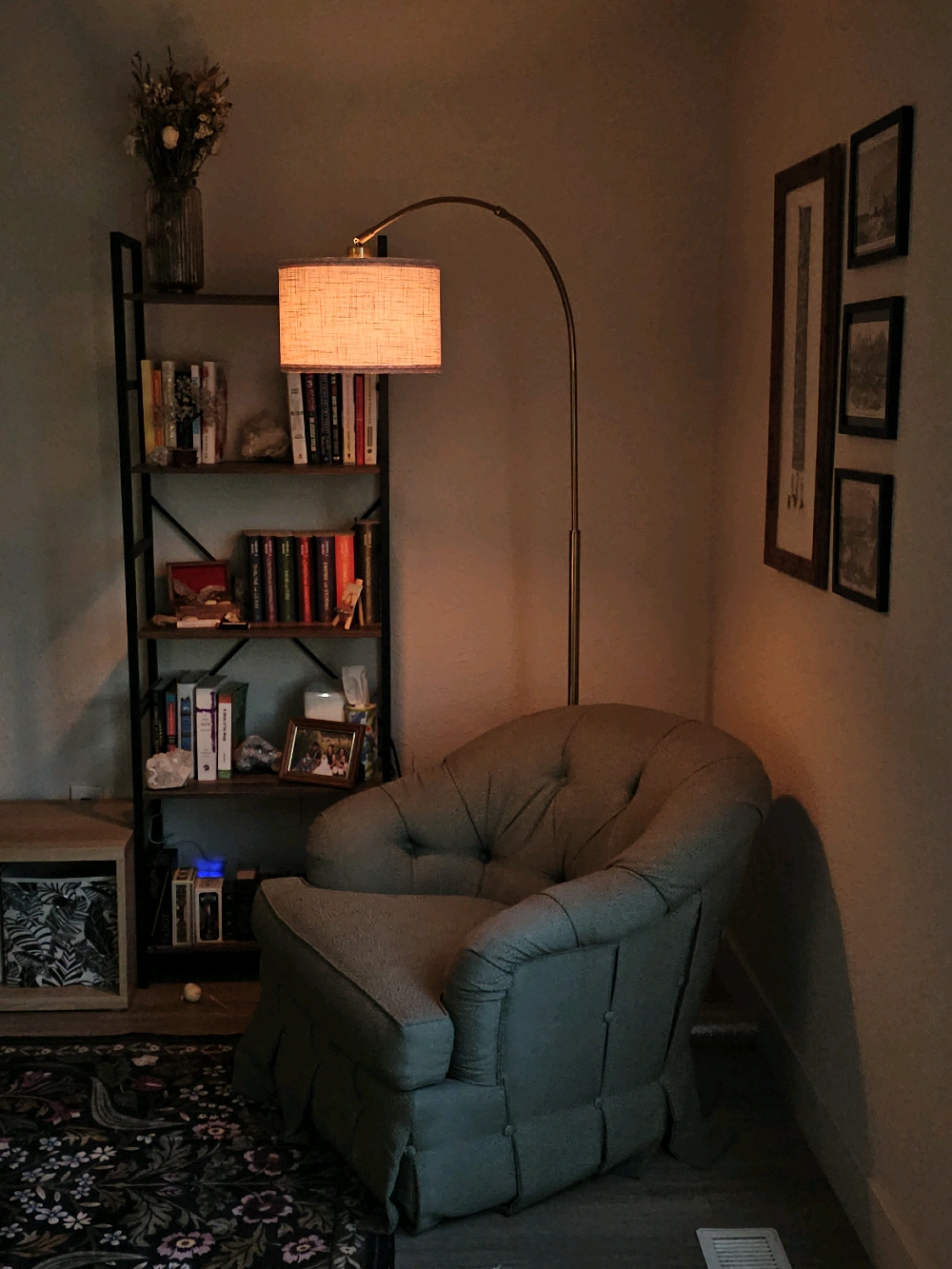 ㅤㅤ٠࣪⭑ new place is coming togetherrrr. i've been sitting here often and maybe i'll finally get to my 10 mile long reading list.