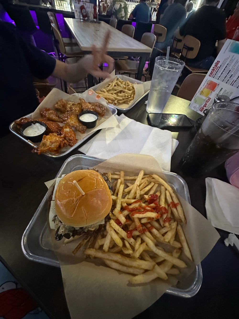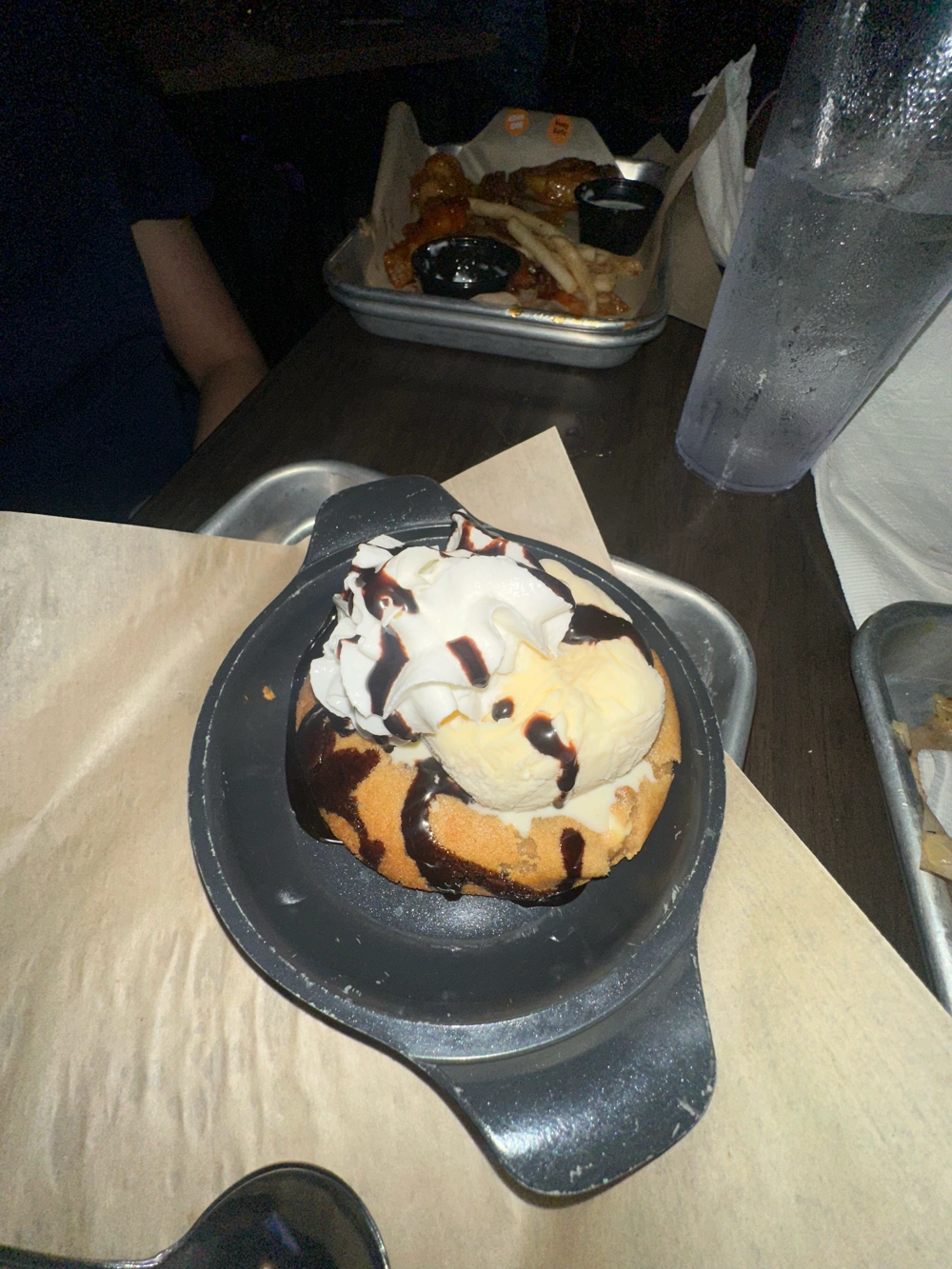 buffalo wild wings, better known as bdubs, serves not only chicken wings, but burgers as well. as someone who used to frequent bdubs in high school on tuesdays after tennis practice, i’ve had enough of their chicken to know i like wingstop better, no disrespect to bdubs. so tonight, i got their mushroom swiss burger and that shit was fucking gobsmackingly delicious, combined with a few hits of the pennifer before we arrived. there was grilled onions and juicy mushrooms and the patties were giving smash burger. they were also bigger than the bun it was in. speaking of the bun, it was soft and sweet and went well with the crispy edges of the burger. GOD I LOVE MUSHROOM SWISSSSS for dessert, we got the triple chocolate chip cookie skillet and it was honestly underwhelming at first glance, but the moment you get the ice cream with the crispy and gooey edge of the cookie, it becomes sooooo worth it. even the bottom of the cookie was stuck in this hard chunk that was so crunchy with the melted chocolate and the cold ice cream was perfect. would def get again. i like the sizing of it because sometimes the chilis one can be too big.