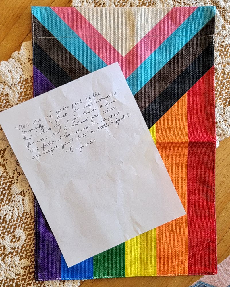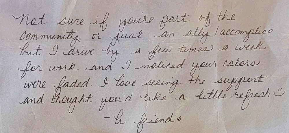 the sweetest thing ever! i've been saying for a whiiile that we need to get a new pride flag because ours has been pretty faded. but this showed up anonymously on our porch! representation and support in your community matters!!! 🏳️🌈🏳️⚧️ thank you, friend!🫶🏻