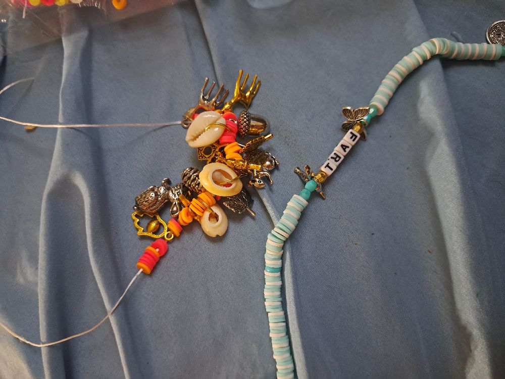 my sweet sixteen year old special needs brother made me the cutest most chaotic charm necklace EVER. i promised him id wear it EVERYWHERE!! the blue is the one i made for him lololol he didnt find it as silly as i did