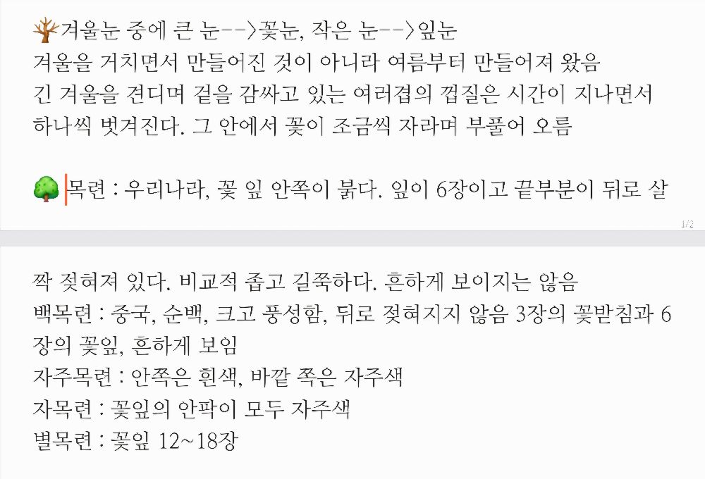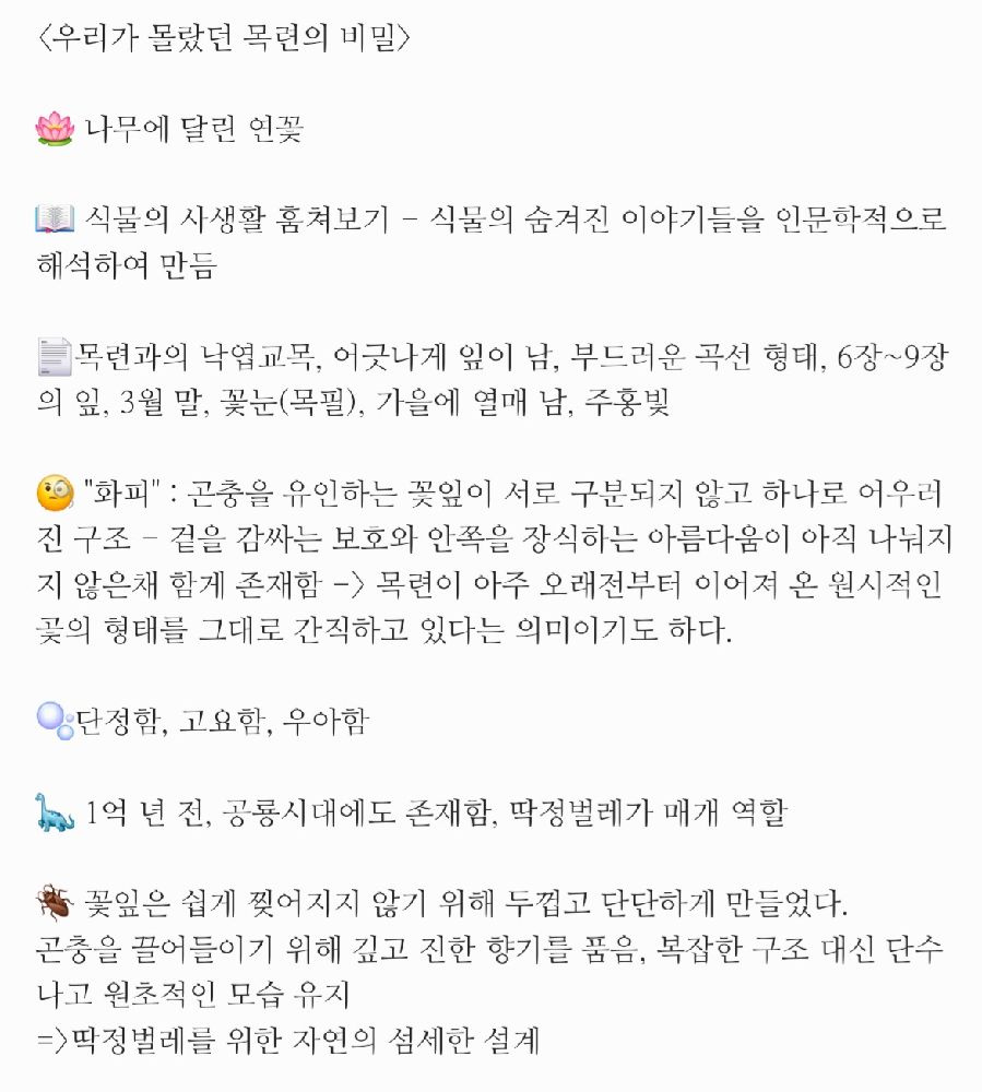 "목련처럼 고요하고 우아한 품격을 내고 싶다." 보이지 않는 시간 속에서도 쉼 없이 준비해 온 꽃 <목련이 보여주는 봄의 시작> "아직 나뉘지 않았기에 더 온전한 모습" <목력 꽃잎속의 비밀> "아름다움을 위해 피어난 꽃이 아니라 살아남기 위해 가장 먼저 완성된 꽃이다." "식물들은 그저 조용히 서 있는 존재가 아니라 각자의 방식으로 선택과 전략을 세우며 살아가고 있는 중이다."