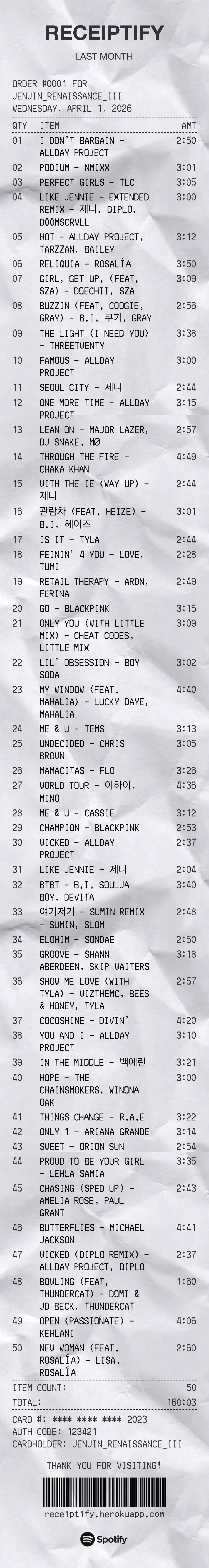 3월 top 음악들은 예상치 못하게 kpop이 점령했다 아니, 사실 예상했던 것 아닌가 I don’t bargain, podium, 라잌제니 리믹스라늠 압도적인 곡들이 3월을 지배했었던 것을 기억하지 않는가 그 외에도 최애곡 반열에 들은 TLC의 perfect girls, girl get up, 인스타 피드 배경 곡이었던 the light 등이 top10에 올랐다 나쁘지 않은 결과다 나머지 곡들 top50은 아래 사진에