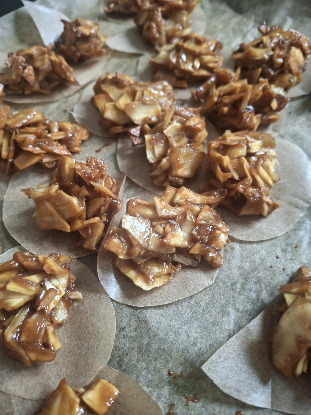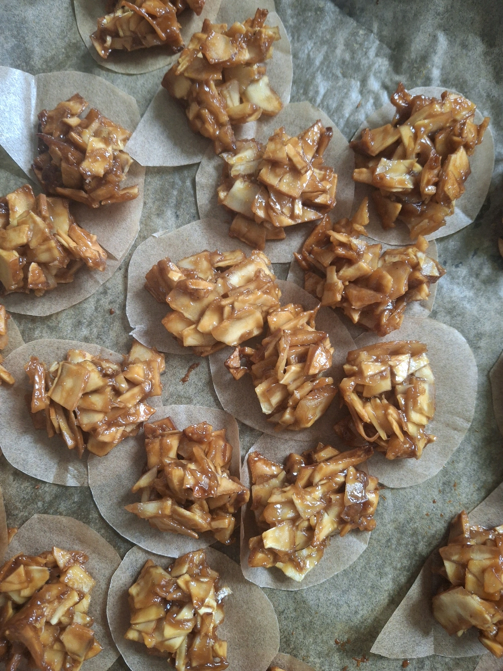 sie schmecken, aber sie sehen sie nicht wie eine richtige Cocada, Ich glaube, ich brauche mehr panela, und der Kokosnuss musst bestimmt gerieben sein, hier sie Stücke waren zu groß, obwohl ich habe versucht kleiner zu machen. Die sind ein klenes etwas für das Frauen Fest meine Vermieterin hat uns eingeladen.